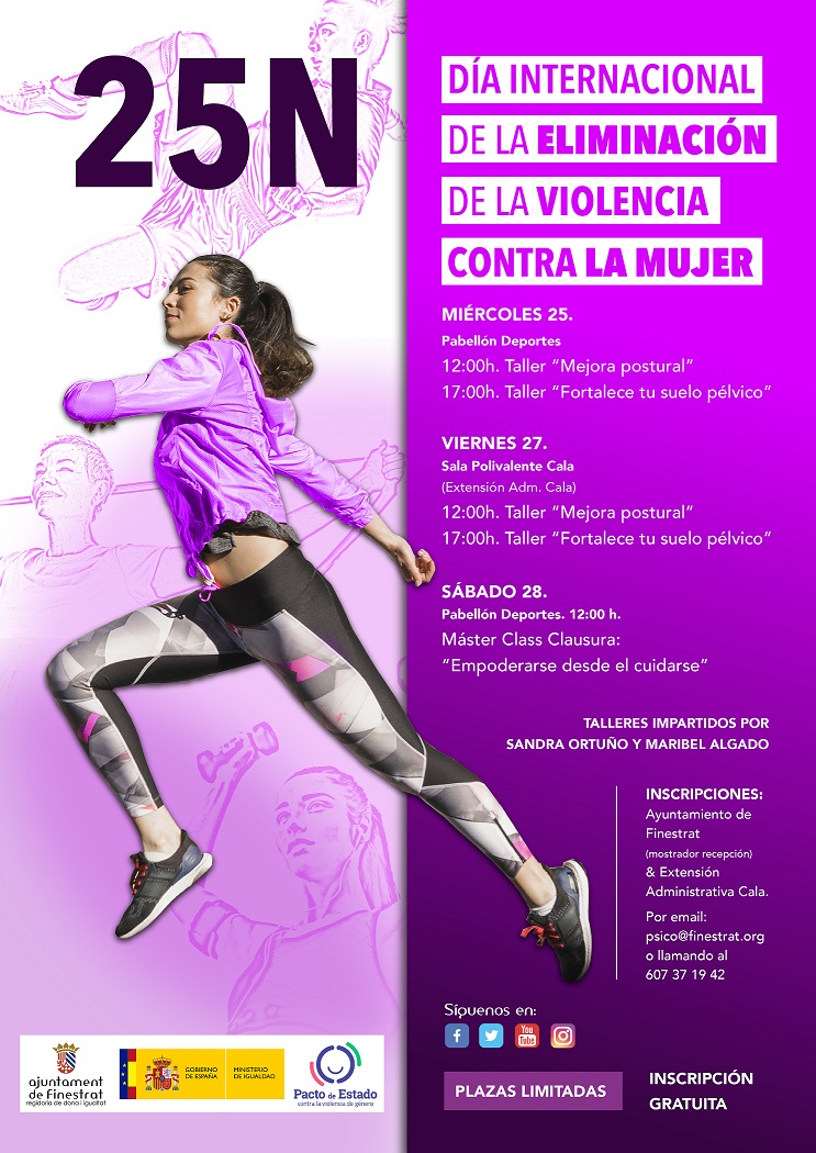 El taller “Mejora postural” se impartirá el miércoles 25 y el viernes 27 de noviembre en el Pabellón de Deportes “La Foia” a las 12:00 horas. “Fortalece tu suelo pélvico” se realizará el miércoles 25 y el viernes 27 noviembre a las 17:00 horas en la Sala Polivalente, Extensión Administrativa de La Cala.