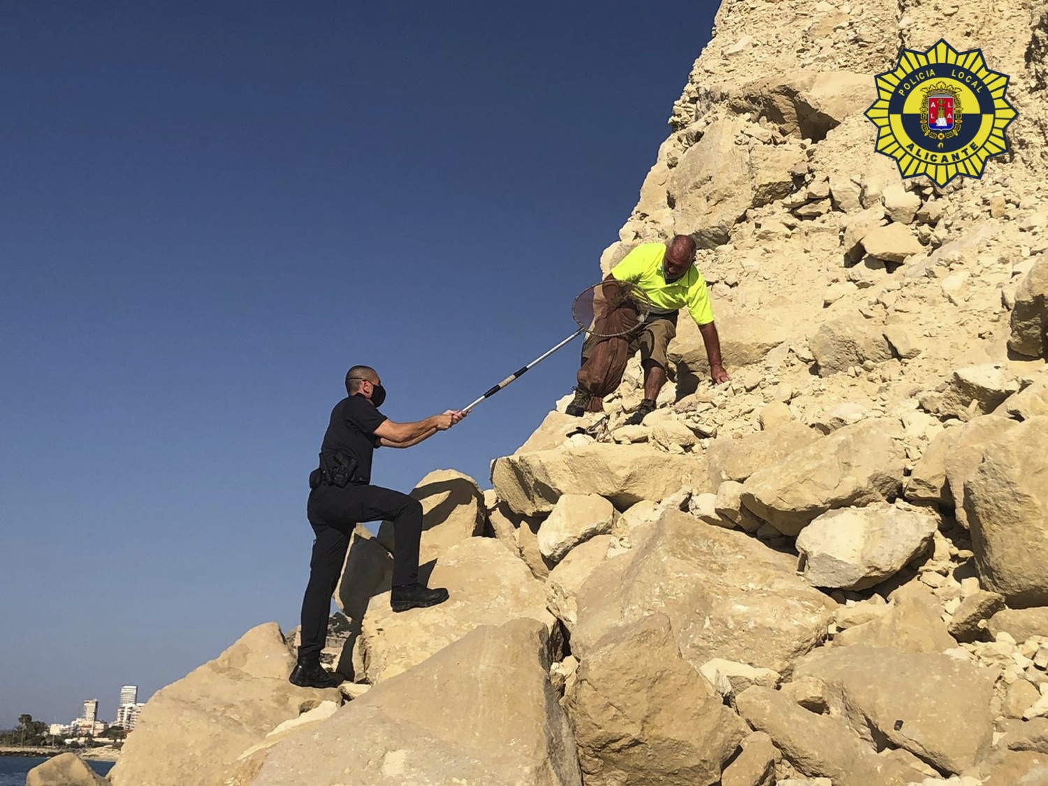 Los agentes de Policía junto con un operario de la protectora de animales han tenido que intervenir en la zona rocosa de la avenida de Villajoyosa esta mañana, sobre las 9 horas, para rescatar a un zorro que había sido visto por la zona. De inmediato se han desplazado varias patrullas con miembros de la protectora de animales y han logrado rescatar al animal para llevarlo a un centro de recuperación de animales en la Santa Faz.