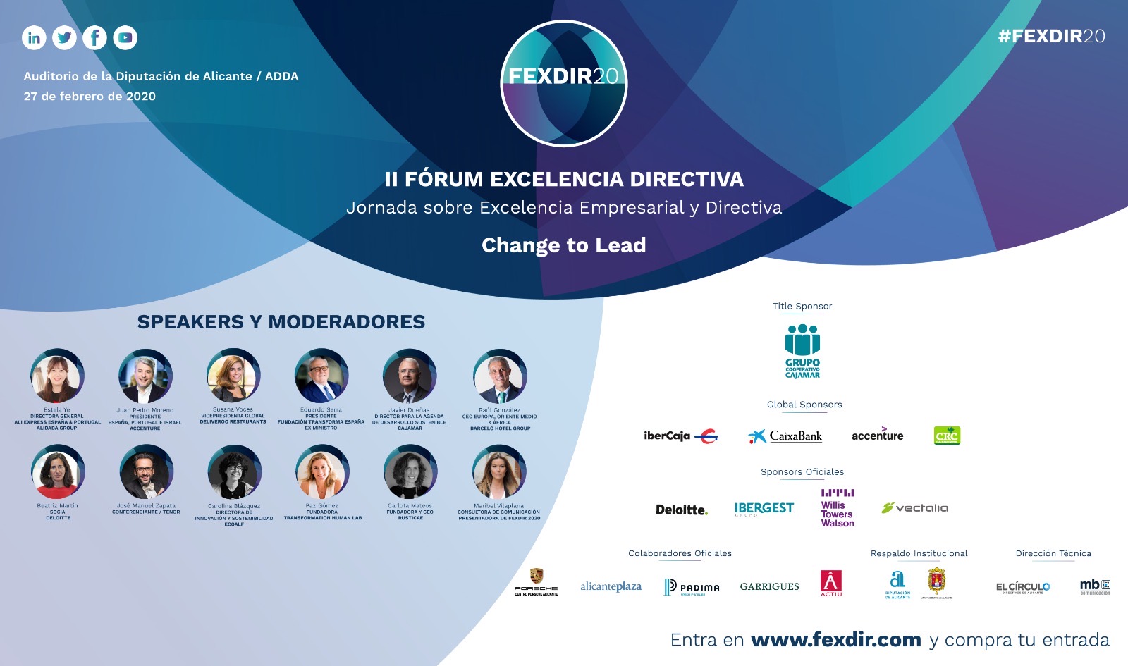 El evento, organizado por El Círculo- Directivos de Alicante y la consultora MB Comunicación, prevé reunir a un millar de asistentes, cifra alcanzada en su primera edición, en el Auditorio de la Diputación Provincial de Alicante, ADDA. El Fórum Excelencia Directiva / FEXDIR cuenta con el respaldo de instituciones como Diputación Provincial, Ayuntamiento de Alicante y asociaciones provinciales: La inscripción para el encuentro está abierta y puede realizarse en la web www.fexdir.com.