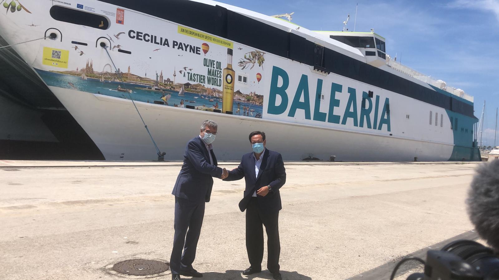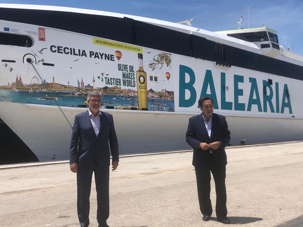 Los presidentes de la Interprofesional del Aceite de Oliva Español, Pedro Barato, y de Baleària, Adolfo Utor, han presentado hoy en el puerto de Denia (Alicante) la nueva imagen del ferry de alta velocidad Cecilia Payne vinilado con la creatividad de la campaña Olive Oil World Tour, que la Organización está desarrollando desde hace dos años en Europa con el apoyo de la Unión Europea.