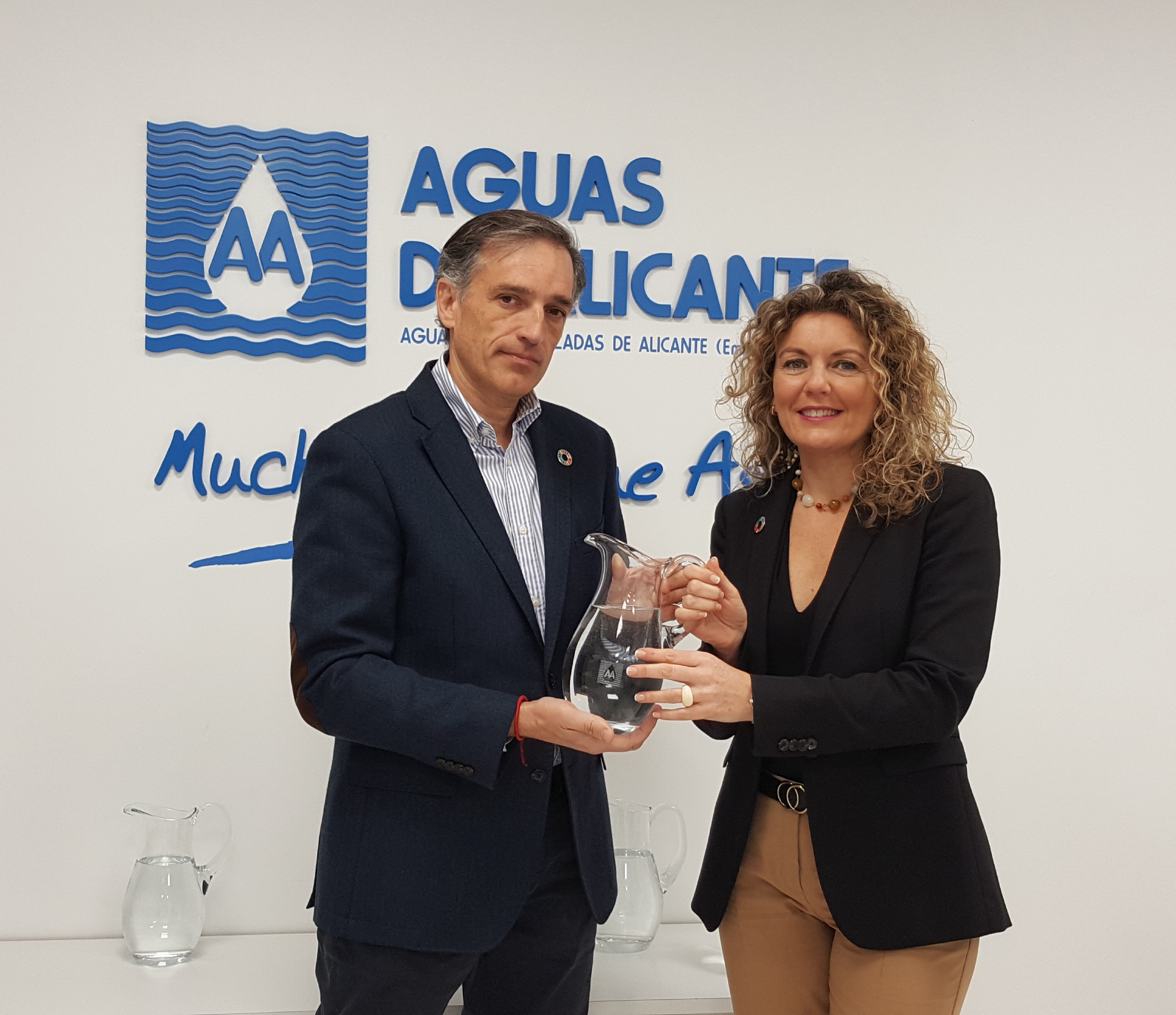Aguas de Alicante prosigue con su campaña de concienciación medioambiental para promover el consumo de agua del grifo entre diferentes entidades, públicas y privadas, representativas de la sociedad alicantina. Francisco Bartual, director general de la compañía, se ha reunido esta mañana con Dolores Mejía, directora general de Mercalicante, para hacer entrega de jarras de vidrio que serán utilizadas en los actos y consejos de administración de esta sociedad mixta, con el objetivo de contribuir a la reducción en la generación de residuos plásticos y a la promoción del consumo de agua de grifo como hábito saludable. Una iniciativa que se enmarca en el compromiso de ambas entidades con los Objetivos de Desarrollo Sostenible.