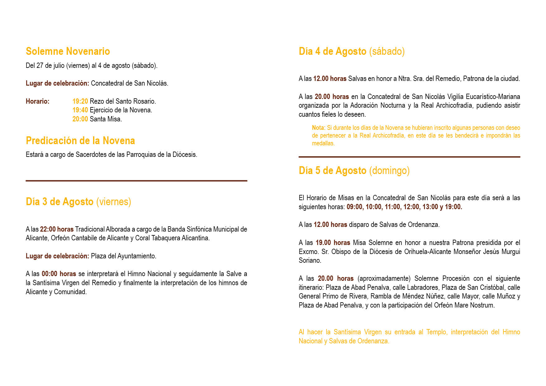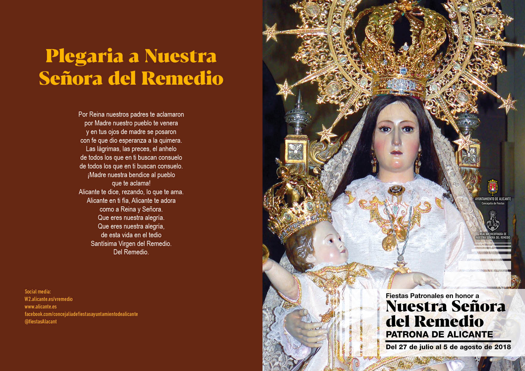 El Ayuntamiento de Alicante organiza, a través de la concejalía de Fiestas, y junto a la Real Archicofradía de Nuestra Señora del Remedio, las Fiestas Patronales en honor a esta Virgen, custodia de la historia de nuestro Pueblo, del viernes 3 al domingo 5 de agosto de 2018.