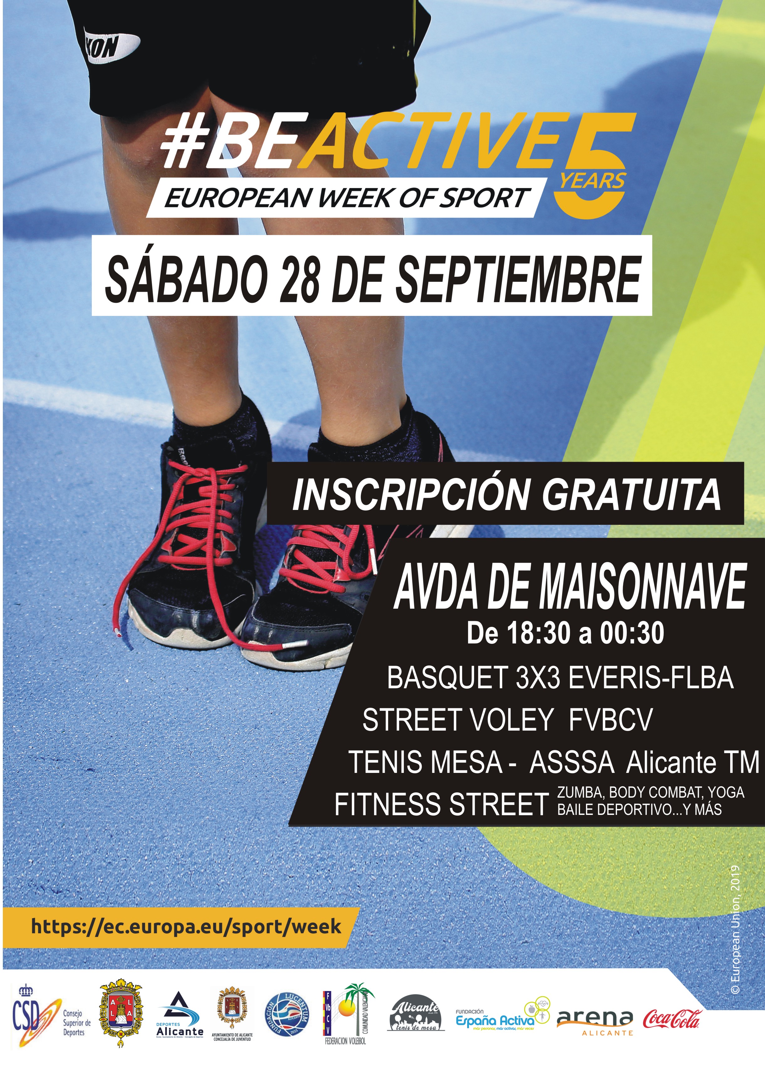 Con motivo de la celebración de la SEMANA EUROPEA DEL DEPORTE, el Consejo de Europa, a través del Consejo Superior del Deporte insta a todos los países europeos a participar de esta fiesta deportiva. En nuestro caso, la ciudad de Alicante, participará con la celebración de #beactivenight , que se llevará a cabo en todas las capitales de provincia al mismo tiempo y cuyo contenido está dirigido a realizar diferentes actividades participativas y GRATUITAS en pleno centro de la ciudad, concretamente en la Avenida de Maisonnave, a lo largo de toda la tarde/noche del sábado 28 de septiembre.