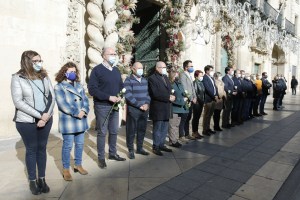 El alcalde de Alicante, Luis Barcala, y la vicealcaldesa, Mari Carmen Sánchez, junto a miembros de la Corporación Municipal, funcionarios y vecinos han guardado este mediodía un minuto de silencio a las puertas del Ayuntamiento en señal de repulsa por el asesinato de Cristina Blanch el pasado viernes a manos presuntamente de su pareja, en un nuevo atentado de violencia de género. Barcala y Sánchez han mostrado su más rotunda condena contra este nuevo asesinato de una mujer joven y con ensañamiento a manos de su pareja. Los ediles han portado una rosa blanca en memoria de Cristina, como ha pedido expresamente su familia.