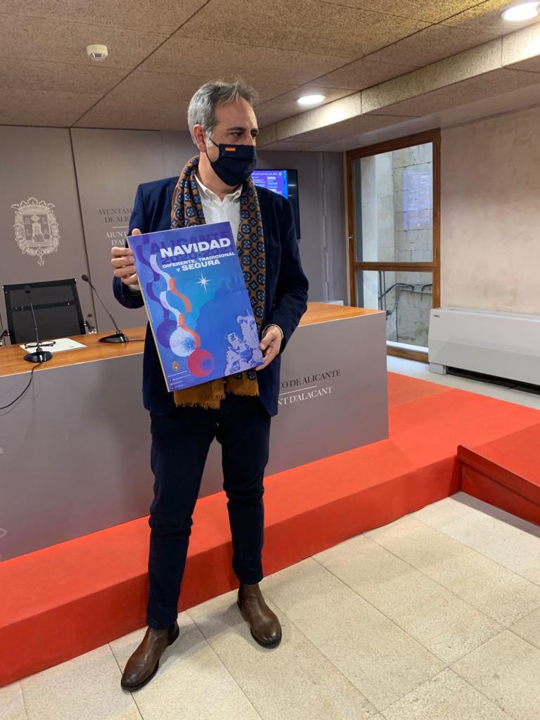 El Ayuntamiento de Alicante ha presentado hoy un amplio programa de actividades de Navidad en el que se mantienen las tradiciones y se preserva la seguridad de la ciudadanía cumpliendo la normativa anti COVID-19. Manuel Jiménez, concejal de Fiestas, ha definido como «diferentes, tradicionales y seguras» las celebraciones navideñas que comienzan hoy con la inauguración del Belén Municipal, situado en el zaguán de la Casa Consistorial. El conjunto de actos ha contado también con la colaboración de las áreas municipales de Comercio, Turismo, Cultura, Deportes, y Participación Ciudadana.