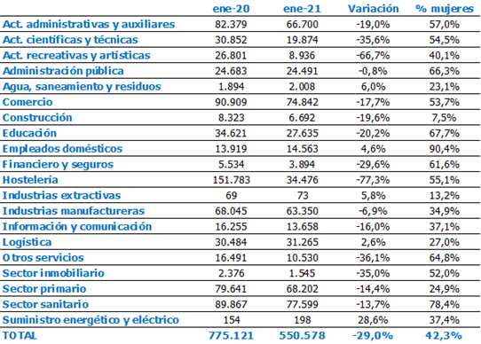 El informe de Randstad analiza las principales magnitudes de la contratación de trabajadoras. Así, los 550.578 contratos firmados por trabajadoras en enero de 2021 suponen el 42,3% del total, una tasa que hace un año se situaba en el 45,1%, 2,8 décimas superior.