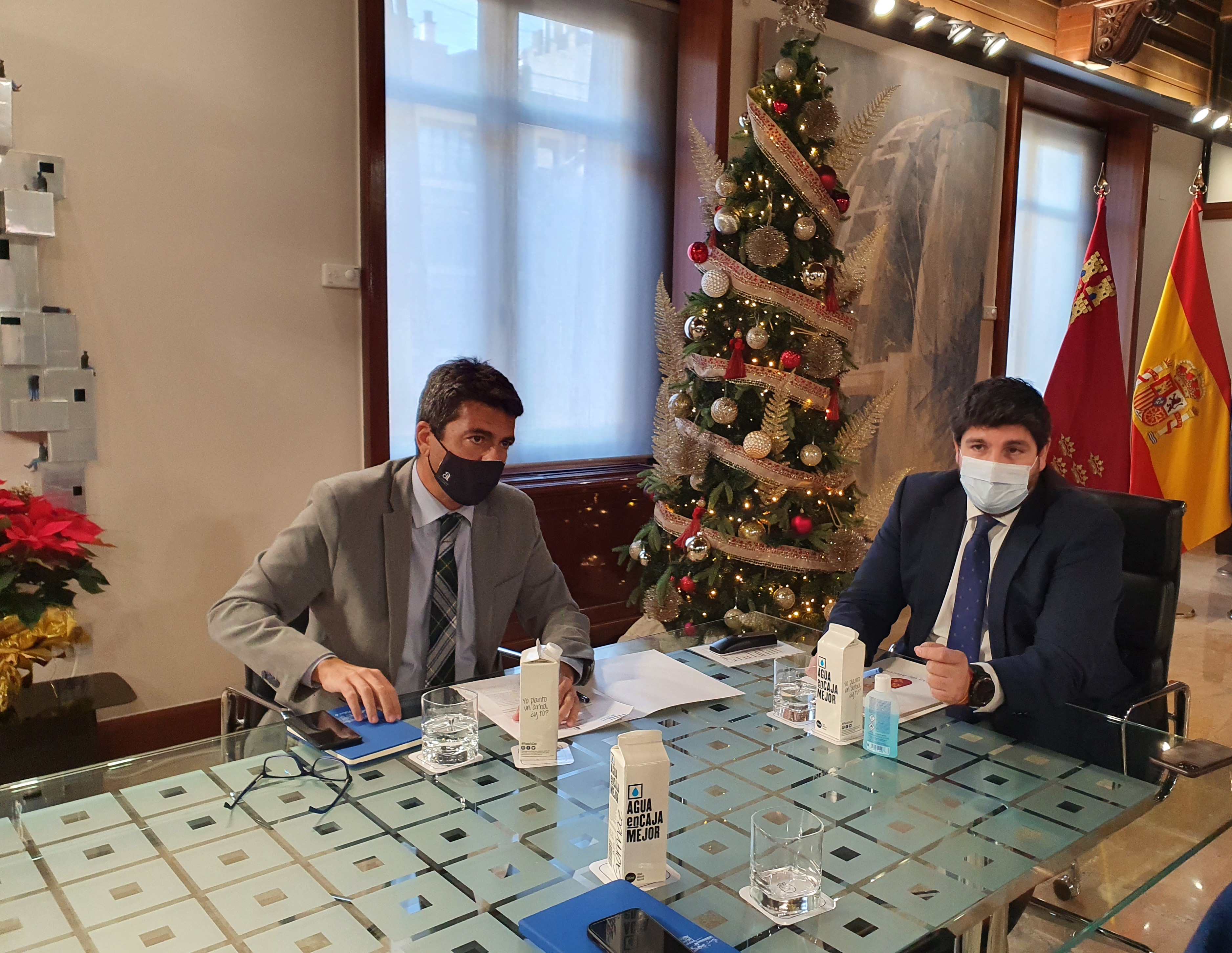 El presidente de la Diputación de Alicante, Carlos Mazón, se ha reunido esta mañana con el presidente de la región de Murcia, Fernando López Miras, para sellar un frente común en defensa del trasvase Tajo-Segura y ha apelado al presidente de la Generalitat, Ximo Puig, y al tripartido valenciano a que se sumen a esta causa.
