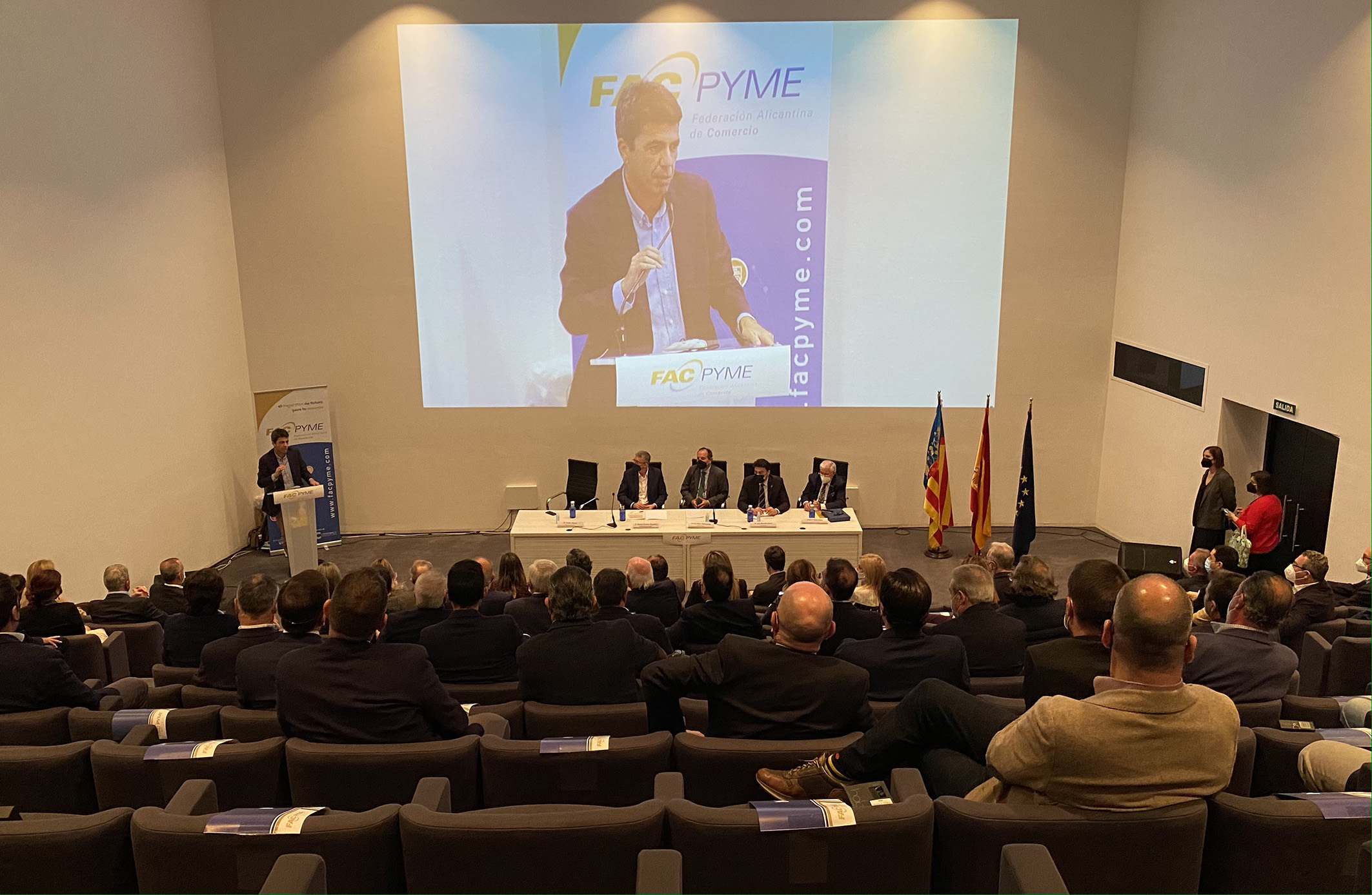 El presidente de la Diputación de Alicante, Carlos Mazón, ha participado esta tarde en el ADDA en la toma de posesión del nuevo presidente de FacPyme -Federación Alicantina de Comercio-, Carlos Baño, que asume el relevo del anterior responsable, Antonio Sáez, tras siete años al frente de la entidad.