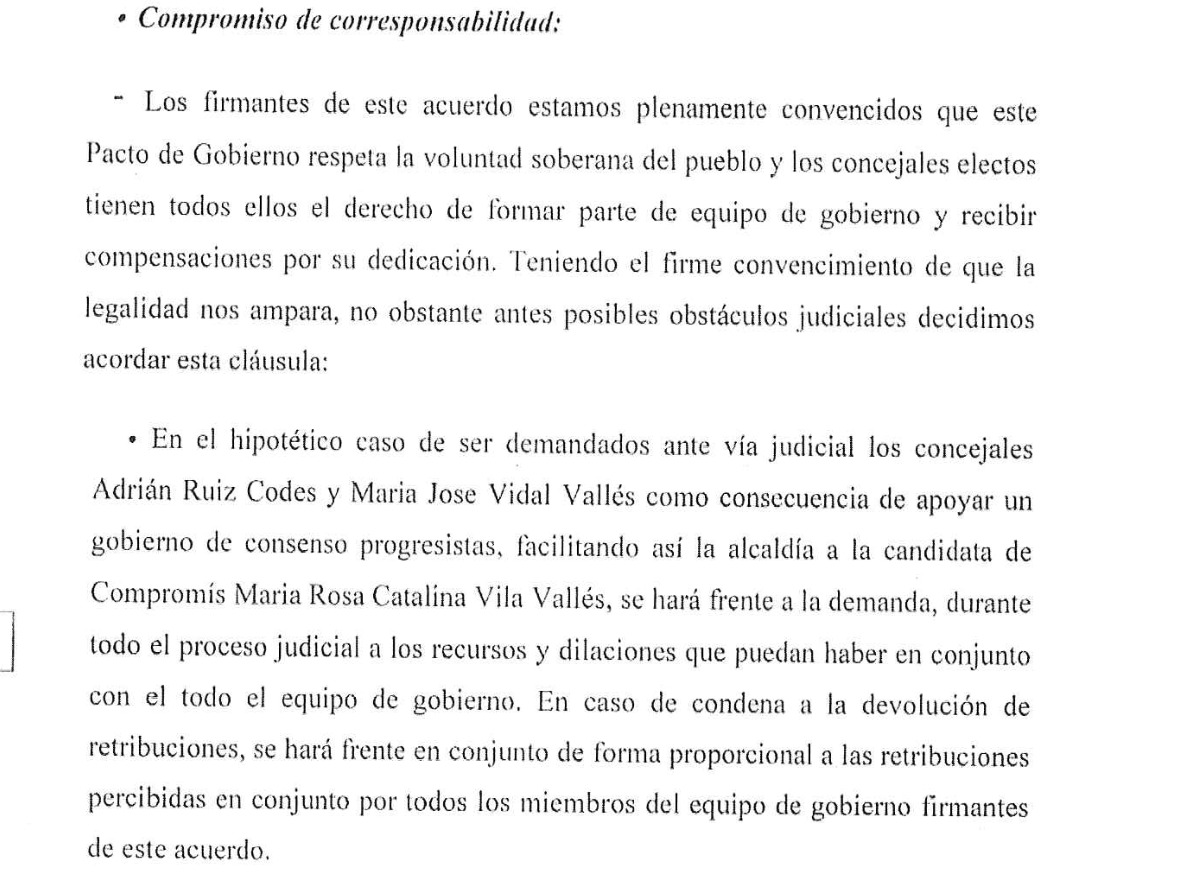 Compromís era consciente de la inmediata expulsión de los dos concejales de Ciudadanos y firmó que se harían cargo de los gastos del proceso judicial y sus retribuciones en caso de que la vía judicial les obligará a devolverla