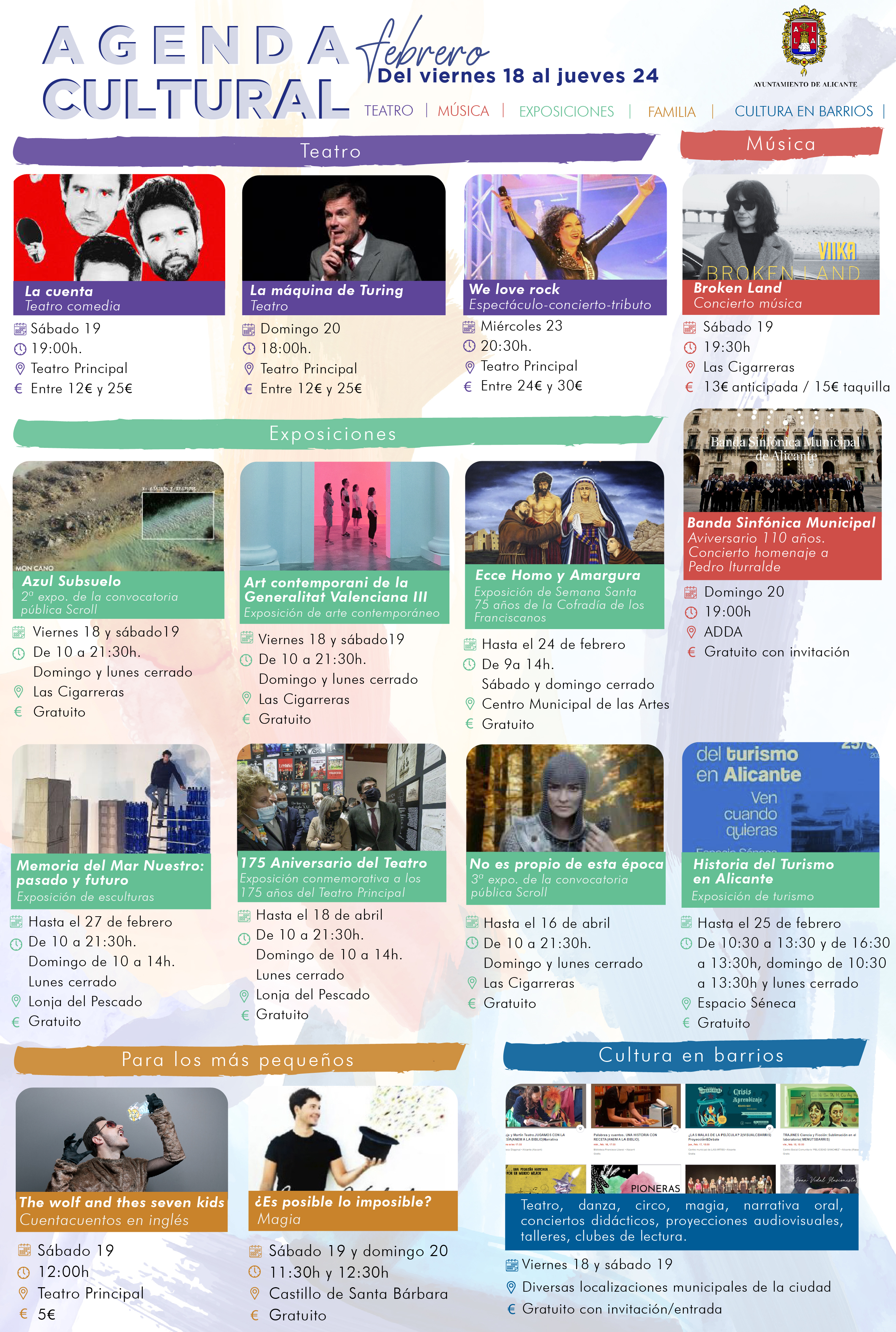 La Agenda Cultural Municipal presenta interesantes novedades en los espacios culturales municipales para este fin de semana. El Teatro Principal acoge la exitosa comedia francesa «La Cuenta» y el concierto tributo a los amantes de la música «We Love Dance». Viika presenta su espectáculo musical en Las Cigarreras donde están disponibles en sus últimos días las exposiciones «Azul Subsuelo» y «Art Contemporani de la GV III». Además, la Banda Sinfónica Municipal actúa en el ADDA para conmemorar su 110 aniversario.