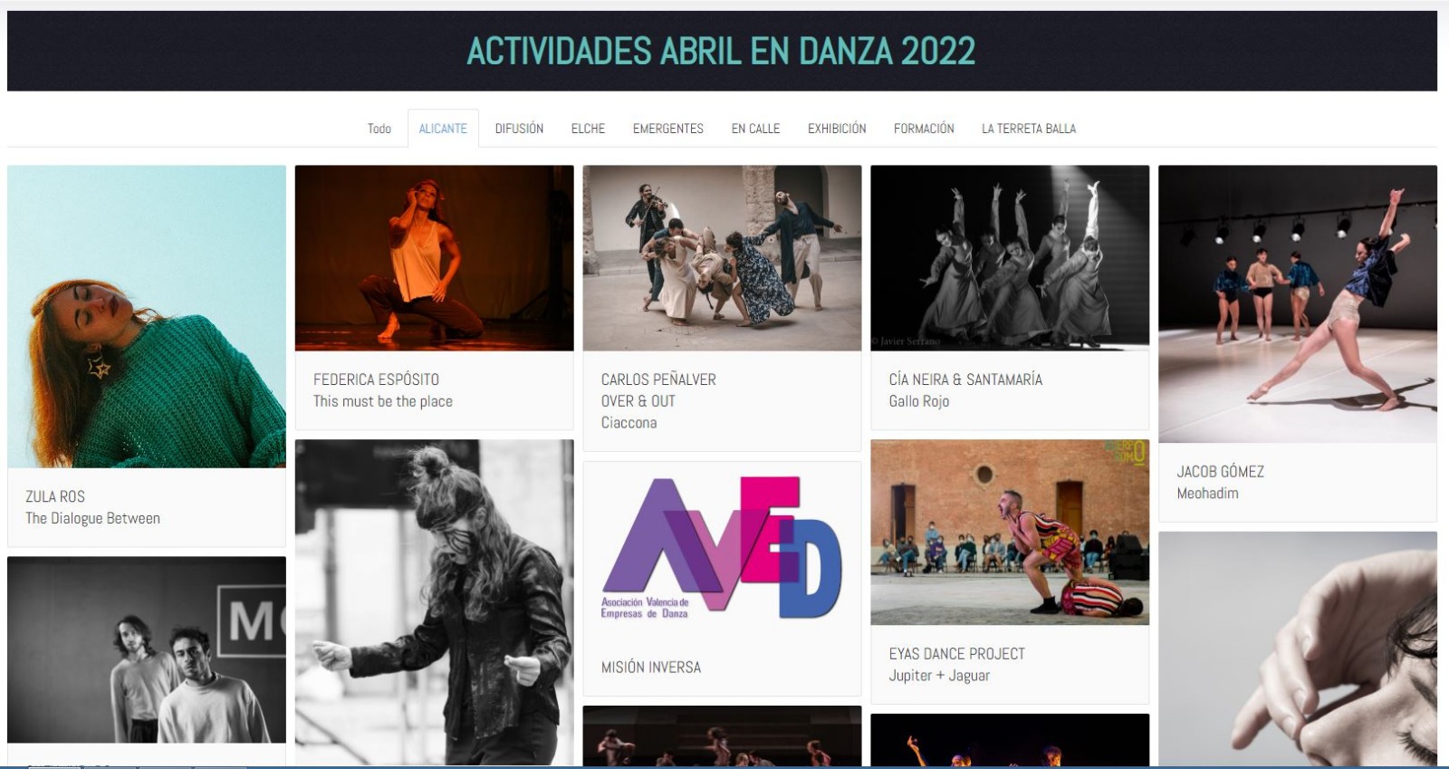 Dentro de las actividades programadas en Alicante destaca la que se llevará a cabo el 8 de abril en el Secadero de Las Cigarreras a las 18.30 horas con Diana Grytsailo y Adrián Zamora (Lo que yo canto), la Compañía Caminantes Danza (Bendita rutina), Eyas Dance Project (Jupiter + Jaguar), y Chey Jurado (Samsara).