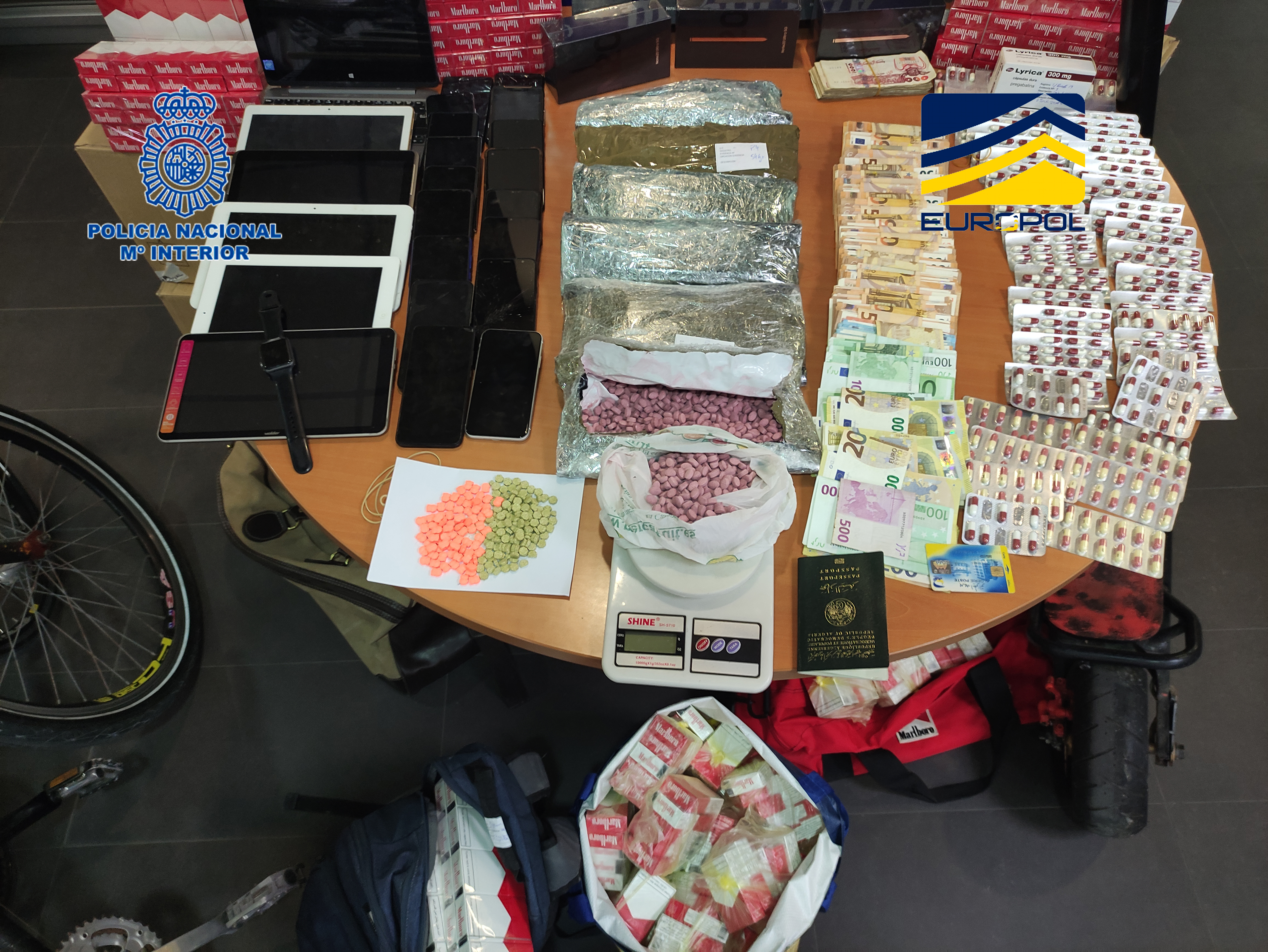 En total se intervinieron más de 40.000 euros en efectivo -tanto en divisa nacional como en dinares argelinos-, cuatro vehículos, tres kilos y medio de éxtasis de la sustancia llamado “tusi” o coloquialmente “cocaína rosa”, 56 gramos de fenciclidina y 710 cajetillas de tabaco de contrabando. Asimismo se localizaron numerosos efectos sustraídos tales como 61 terminales móviles, tres bicicletas de competición, patinetes eléctricos, varios dispositivos electrónicos, diversos documentos de identidad de terceras personas, tarjetas bancarias y numerosa documentación vinculada con la investigación.