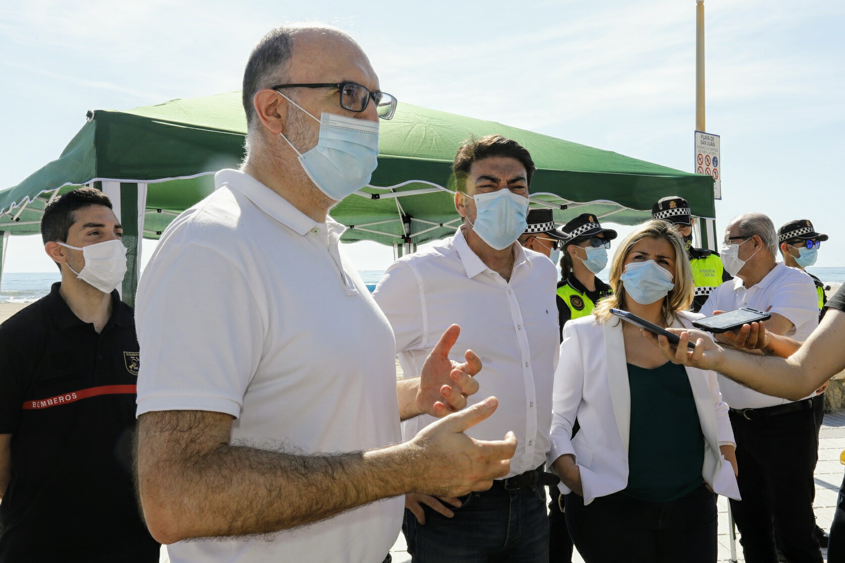 El alcalde de Alicante, Luis Barcala, y la vicealcaldesa y responsable del Patronato de Turismo, Mari Carmen Sánchez, han presentado hoy el dispositivo preparado por el Ayuntamiento de Alicante para garantizar una reapertura segura de las playas alicantinas a partir del 1 de junio. El objetivo del mismo es permitir el baño, tomar el sol y realizar algunas prácticas deportivas al aire libre con todas las medidas de distanciamiento e higiene necesarias. En el acto también estuvieron presentes los concejales de Seguridad, José Ramón González, y Limpieza, Manuel Villar, además de representantes de la Policía Local, Bomberos y Protección Civil.