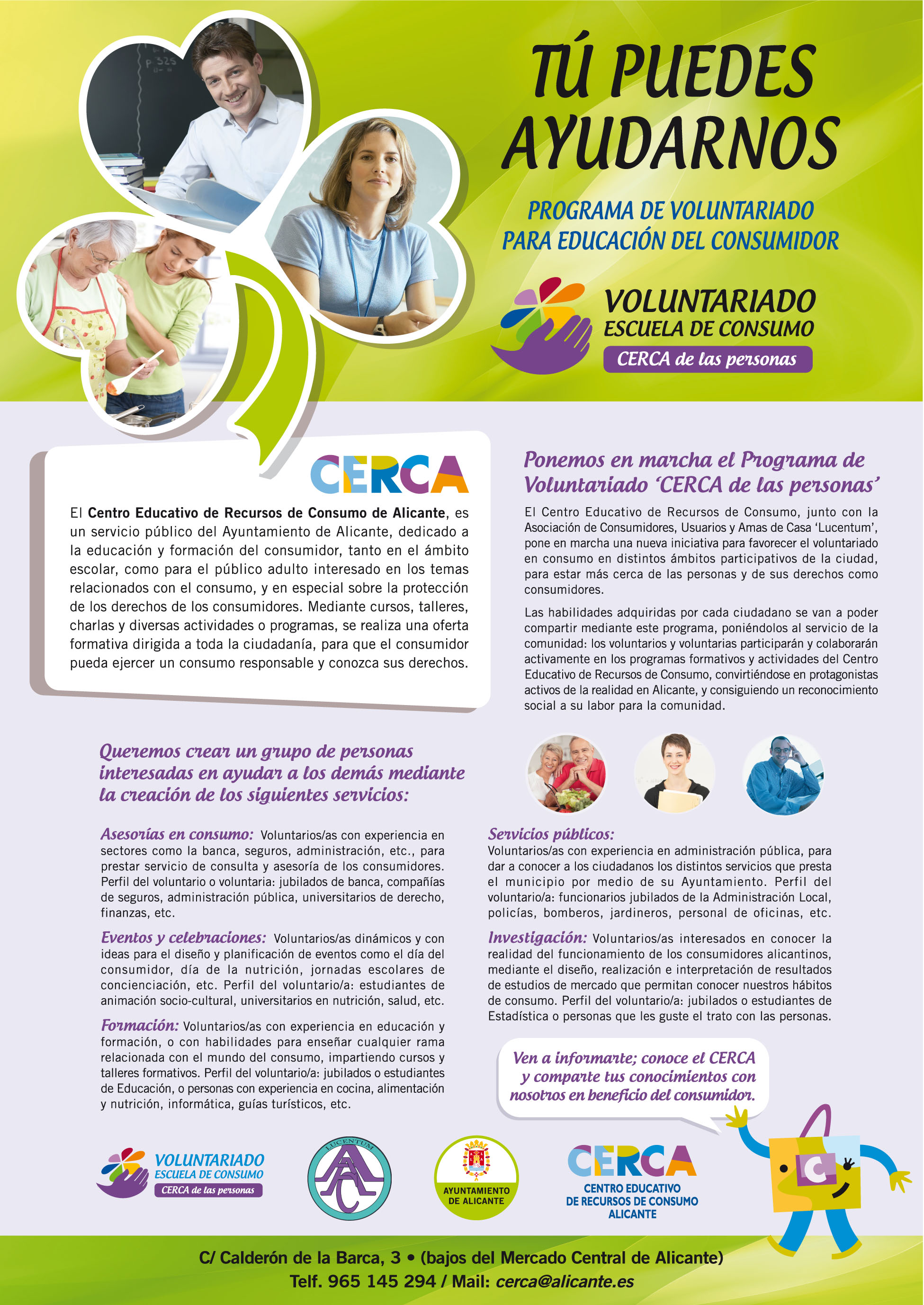 El Centro Educativo de Recursos de Consumo de Alicante (CERCA), es un servicio público creado por el Ayuntamiento de Alicante, que se dedica a la educación y formación del consumidor mediante cursos, talleres, charlas y diferentes actividades con el objetivo de proteger y enseñar los derechos de los ciudadanos y fomentar una compra responsable. Por ello, apunta López, «los voluntarios realizan una labor fundamental en la divulgación y promoción de los derechos del consumidor, así como en el impulso del consumo sostenible».