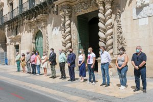 El Ayuntamiento de Alicante se ha sumado esta mañana al minuto de silencio, celebrado en la puerta del Consistorio al mediodía, como muestra de condena y rechazo del asesinato del joven Samuel en La Coruña este fin de semana a manos de otros jóvenes con actitudes violentas y homófobas.