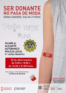 Bajo el lema ‘Ser Donante No pasa de Moda. Dona Sangre Salva 3 vidas’, se ha puesto en marcha la campaña para difundir esta jornada solidaria, que se realiza anualmente impulsada por la Asociación Sociocultural de Policías Locales de Alicante con el objetivo de fomentar la donación de sangre al personal de Policía y del Ayuntamiento, y ya ha conseguido año tras año excelentes resultados. El Concejal de Seguridad, José Ramón González, animó y agradeció a todos los policías, funcionarios y alicantinos solidarios que acuden siempre que se les solicita a esta cita para donar sangre, al tiempo que valoró muy positivamente esta iniciativa destacado que «todas las instituciones tenemos la obligación de apoyar esta labor tan importante que realiza el Centro de Transfusión de Sangre». La Donación de Sangre estará en todo momento supervisado por un equipo médico, y los donantes que deseen participar, deben cumplir con unos requisitos mínimos como son: tener entre 18 y 65 años, pesar más de 50 kilos y gozar de una salud normal, se recomienda antes de la donación tomar líquidos y no venir en ayunas.
