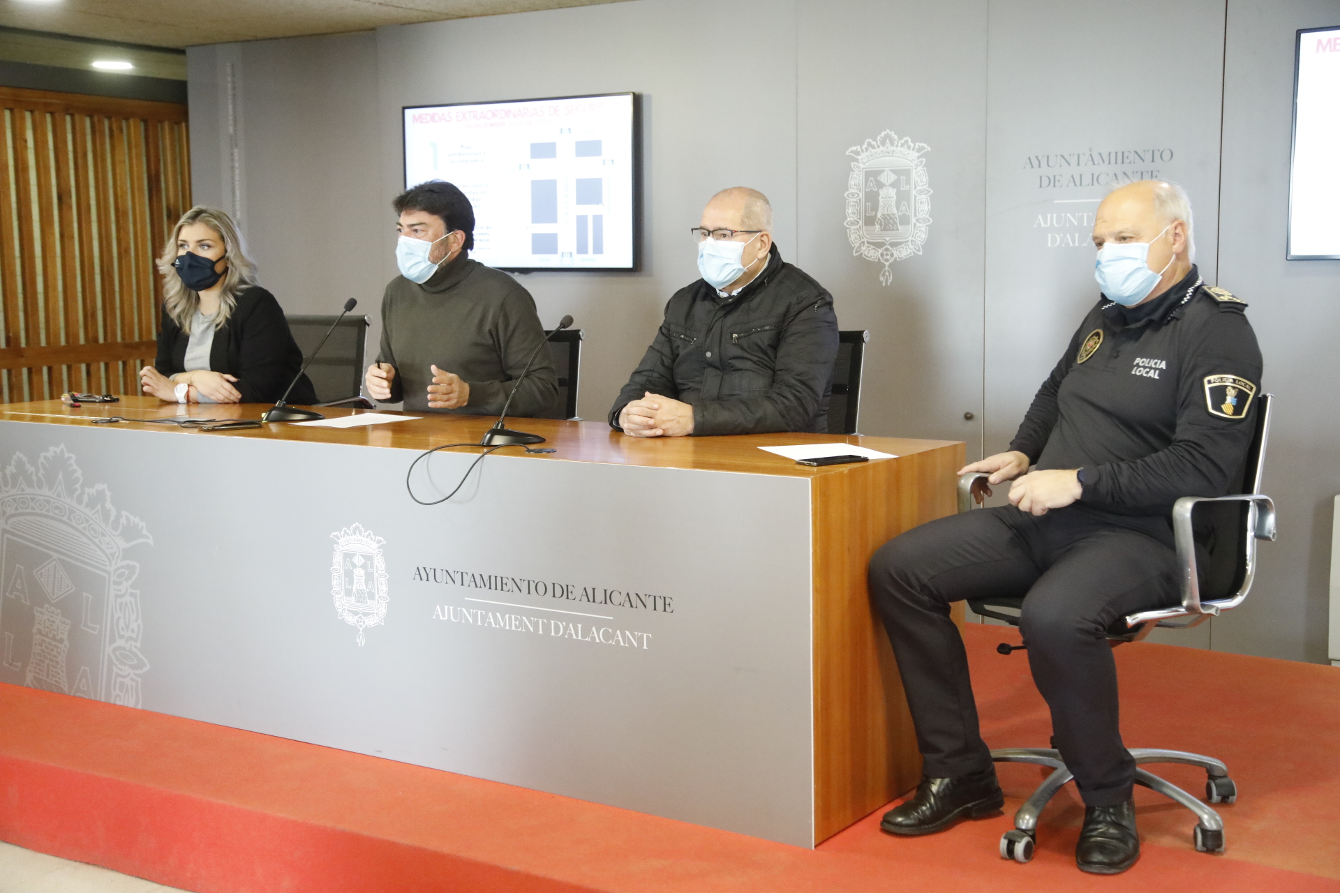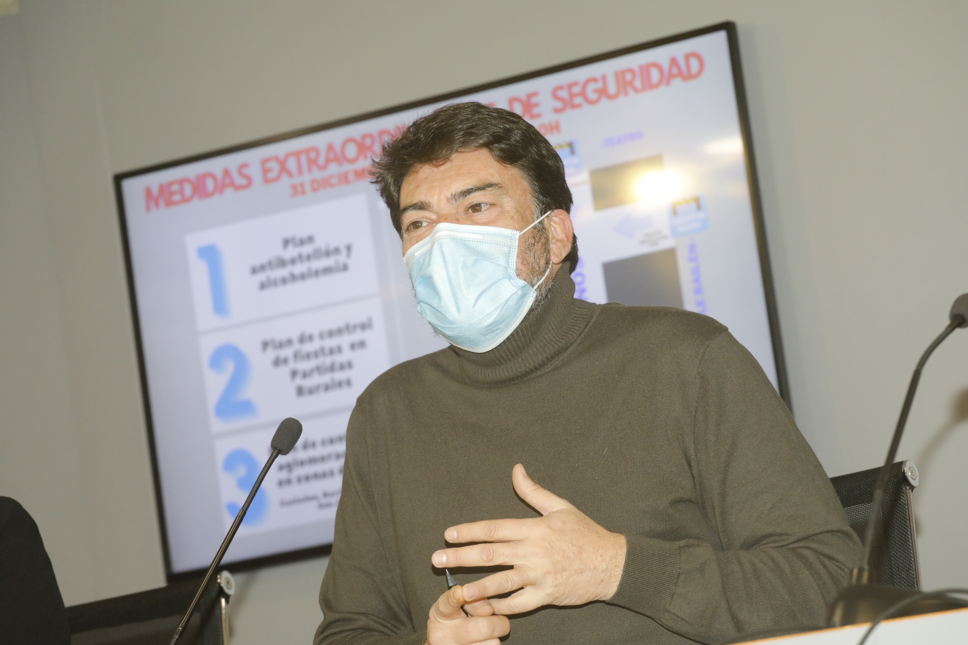 El alcalde de Alicante, Luis Barcala, ha dado a conocer hoy el operativo especial diseñado por el área de Seguridad del Ayuntamiento de Alicante para el 31 de diciembre. En rueda de prensa, Barcala, que ha estado acompañado por la vicealcaldesa, Mari Carmen Sánchez, el concejal José Ramón González, y el comisario principal, José María Conesa, ha anunciado que «el gobierno municipal de Alicante ha decidido declarar el día 31 como de ‘Alto Riesgo’ ante el temor de que las celebraciones por el fin de año, un año lleno de noticias malas por la pandemia, puedan ocasionar una ola de posibles contagios de coronavirus».
