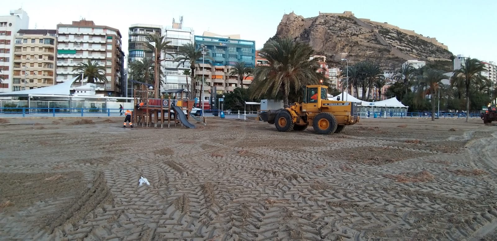 El Ayuntamiento de Alicante ha comenzado hoy los trabajos de recuperación de las playas del término municipal que han resultado dañas por los efectos de la borrasca Gloria. Desde primera hora de la mañana efectivos de la UTE han estado trabajando en la playa del Postiguet para limpiar los restos de algas y otros elementos que el temporal ha depositado sobre la arena. Estos trabajos también se desarrollarán en el resto de las playas del término municipal para «devolverlas a la normalidad en el menor tiempo posible», según manifestaciones del concejal de Limpieza, Manuel Villar, que ha acudido acompañado del concejal de Urbanismo, Adrián Santos Pérez, y de técnicos municipales a inspeccionar los daños sufridos en la franja litoral del término municipal de Alicante.