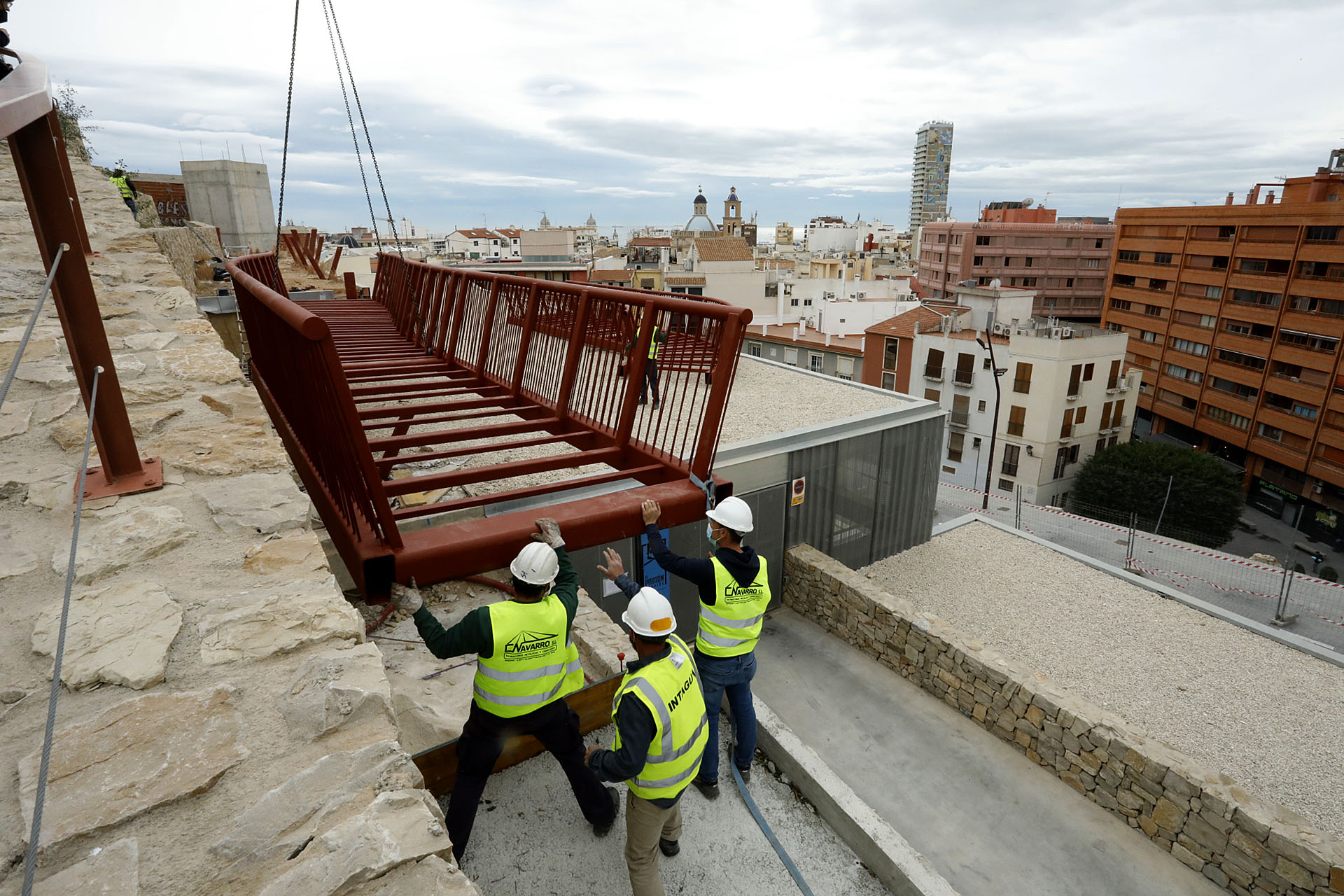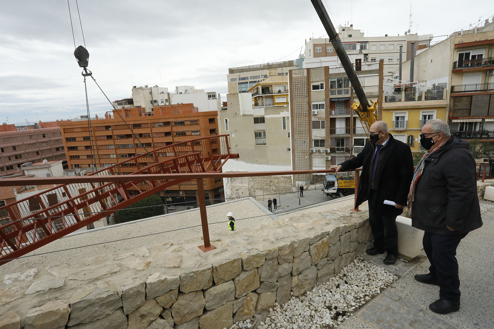 El Patronato Municipal de la Vivienda del Ayuntamiento de Alicante, presidido por el edil José Ramón González, ha creado un nuevo itinerario peatonal de acceso al barrio de Santa Cruz, con la instalación esta mañana de una pasarela metálica de 80 metros de largo con suelo de madera anti deslizante reforzada y anclada sobre unos pilares.