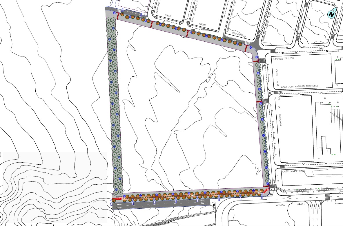 La urbanización proyectada incluye la creación de una nueva calle peatonal de 10 metros de anchura en la Avenida Jaime I que cierre la parcela por el Oeste. A su vez, se dotará de continuidad al carril bici de la zona, el alumbrado público se realizará con luz LED, habrá una red de riego automatizada y la jardinería de la zona contará con especies arbóreas como la morera blanca.