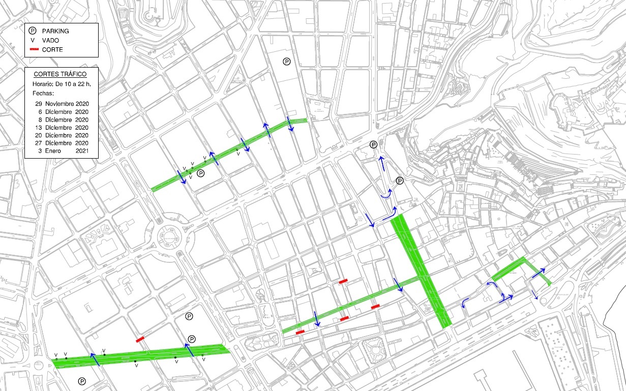 Por ello, está previsto cerrar al tráfico rodado los siguientes corredores y el estacionamiento los domingos del 29 de noviembre al 3 de enero, y el martes 8 de diciembre: