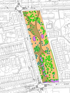 De igual modo se realizará un camino que recorrerá la parcela longitudinalmente y conectará la zona de mascotas con los principales accesos. Se realizará también una zona estancial dotada con bancos y se plantará especies arbustivas con el fin de embellecer el entorno. Finalmente, se realizará la instalación de una red de riego centralizada que permita su control remoto para una mejor gestión del agua.