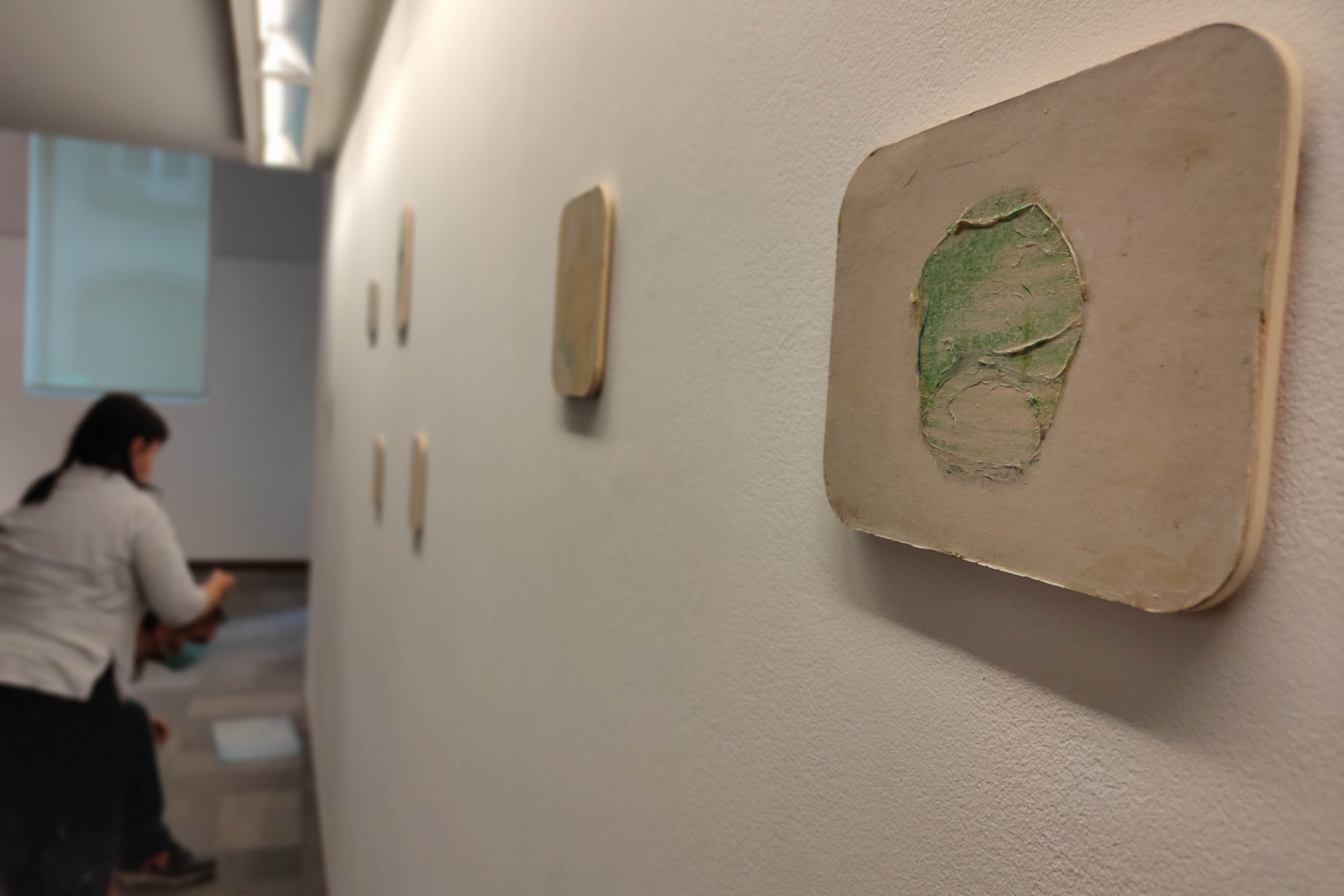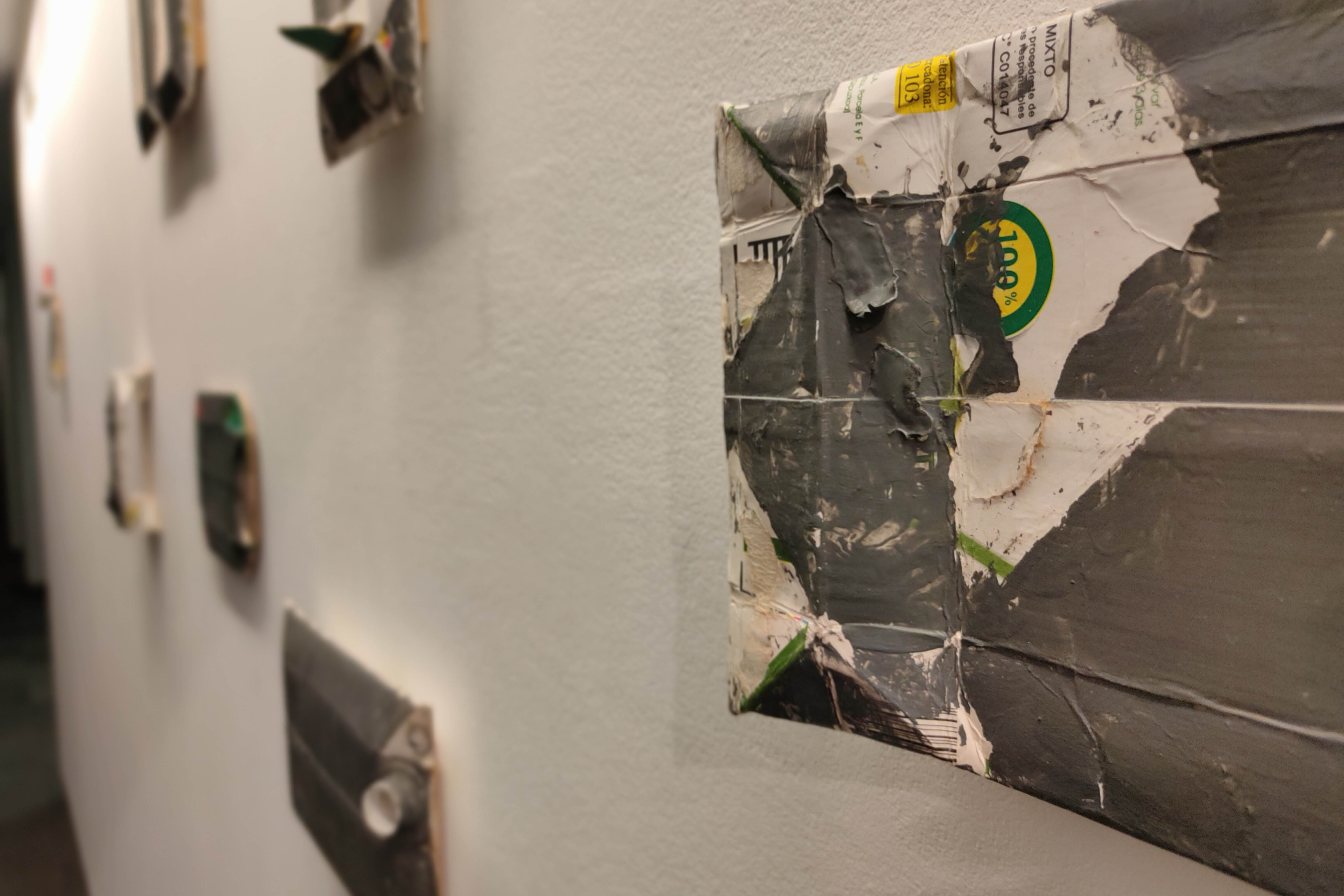 Los bri(c)ks son ‘encontrados’ por la mirada del artista, descompuestos para conocer su patrón y reconstruidos en una nueva vida reinterpretada por Aurelio Ayela. Tapas de envases de comida con sugerentes manchas de grasa que sirven para inspirar motivos de círculos en pintura gris asfáltica, líneas compuestas por palillos mondadientes, dobleces de los cartones o palabras aleatorias nos ofrecen un repertorio muy urbano de nuevas obras creadas sobre existencias anteriores. Objetos que reviven en multiversos: cada uno posee infinidad de posibilidades de ser.