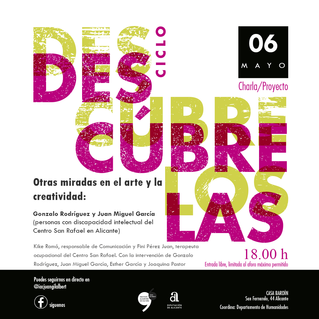 Por otra parte, el ciclo ‘Descúbrelos/las’ ofrecerá el viernes, 6 de mayo, la propuesta ‘Otras miradas en el arte y la creatividad’, con la participación de Gonzalo Rodríguez y Juan Miguel García, artistas y usuarios del Centro San Rafael de Alicante de atención a personas con discapacidad intelectual, que hablarán y mostrarán su trabajo. El acto contará también con la intervención de Esther García, directora de Mediación y fundadora de DaGuten Escuela Gráfica de Barrio, Joaquina Pastor, mediadora del Centro San Rafael, Kike Romá, responsable de Comunicación, y Fini Pérez, terapeuta ocupacional del Centro San Rafael.