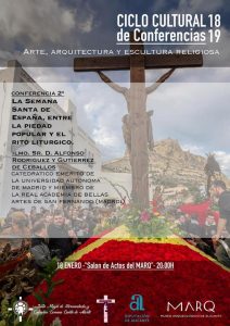 Este viernes, 18 de enero, en el Salón de Actos del Museo Arqueológico de Alicante -MARQ- a las 20.00h, se celebra la segunda conferencia del Ciclo Cultural de la Junta Mayor de Hermandades y Cofradías de la Semana Santa Alicante, bajo el título: «La Semana Santa en España: entre la piedad popular y rito litúrgico».