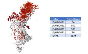 Las previsiones de AEMET apuntaban la posibilidad de tormentas secas, con la consiguiente caída de rayos y por tanto igniciones simultáneas de incendios debido a las escasas precipitaciones previstas. En este sentido, durante todo el episodio se han contabilizado 1379 rayos, con la distribución diaria que se puede ver en el mapa y la tabla adjuntas en la imagen.