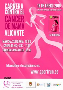 Este domingo 13 de enero tendrá lugar en Alicante la Carrera contra el Cáncer de mama, donde habrá también una marcha solidaria, carreras de 4k y 8k y carreras infantiles. Las inscripciones se pueden efectuar en la web http://www.sportrum.es