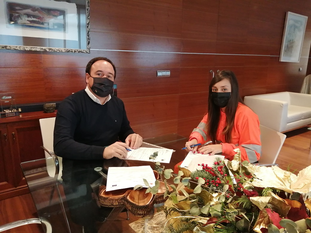 El alcalde de Finestrat, Juanfran Pérez Llorca, firma el contrato con una joven de Finestrat que se incorpora hoy a los Servicios Técnicos del Ayuntamiento, en las tareas de servicios de limpieza viaria.