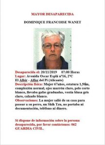 El cuerpo sin vida de una mujer de 67 años de nacionalidad belga que desapareció el pasado miércoles fue hallada anoche en la zona de l’Albir, en el municipio alicantino de l’Alfàs del Pi. Según han informado fuentes de la Guardia Civil de Alicante, el cadáver de la mujer, que no presentaba sIgnos de violencia, fue encontrado por los bomberos a última hora de este viernes en una pinada del lugar.El cadáver de la mujer fue encontrado por los bomberos a última hora de este viernes en una pinada del lugar sin signos evidentes de violencia