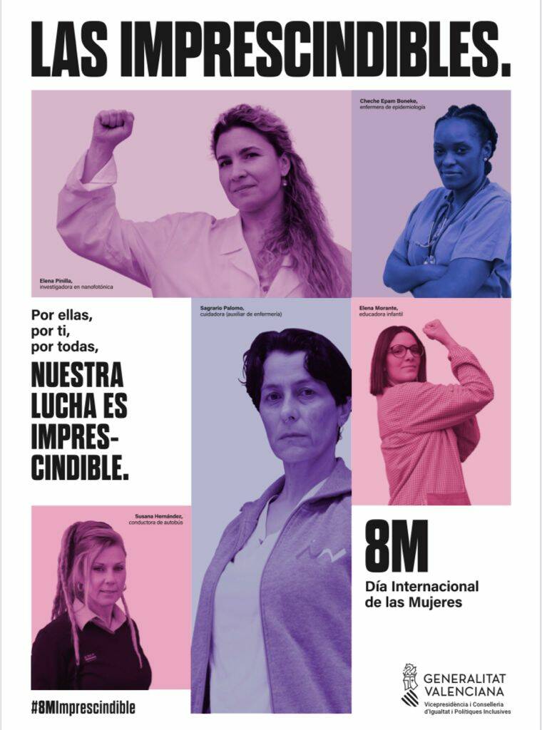 La principal imagen de la campaña, denominada ‘Imprescindibles’ es una mujer puño en alto, gesto asociado tradicionalmente a una determinada opción política. La concejal de Ciudadanos considera que con la elección de este cartel “la Generalitat Valenciana se está apropiando del concepto de mujer que es mucho más amplio de lo que en él se muestra” a través de imágenes y mensajes “con una fuerte carga ideológica que en absoluto refleja los pensamientos de todas”. Julia Parra considera “totalmente inapropiado” la difusión de este material, al entender que “el Día de la Mujer debe ser una reivindicación de las necesidades de las mujeres, no un instrumento partidista”.