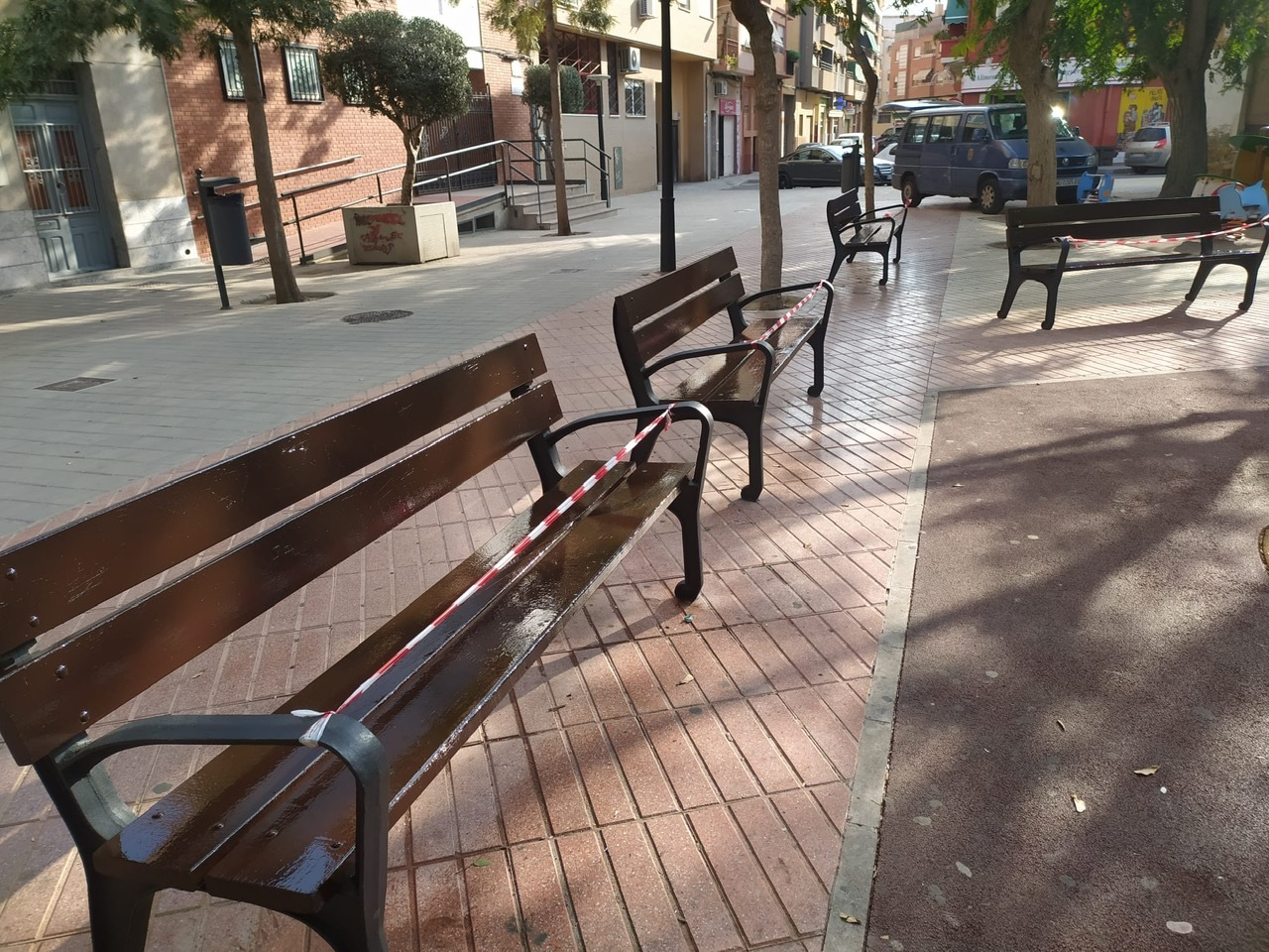El Ayuntamiento ha finalizado la reparación de la Plaza Magallanes, San Antón, Paseíto Ramiro, la plaza de la Santa Faz y avanza en el pintado de los bancos de la Plaza Séneca y juegos infantiles de la Plaza de los Cinco Soles en el barrio de Rabasa