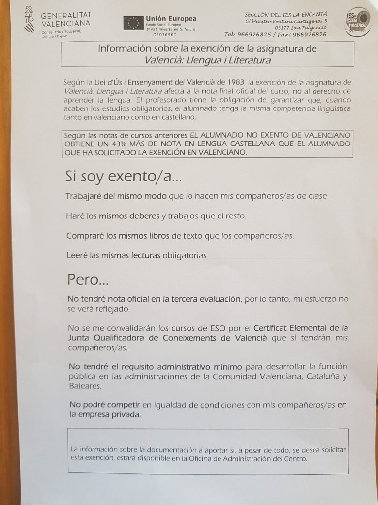 Muchas familias en la Comunidad Valenciana nos están alertando de la presión que reciben desde la Consejería de Educación. A los padres que piden exención de valenciano, les hacen firmar este documento disfrazado de nota informativa. Está a pie del documento oficial descargable desde la web de consejería: “La exención de valenciano puede aplazar o impedir la consecución de los objetivos de una educación plurilingüe plena y el logro de los objetivos curriculares de todas las lenguas y puede poner en desventaja el alumnado para afrontar las exigencias y los retos de nuestra sociedad en un futuro inmediato”.