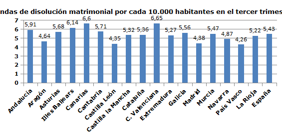 La Comunidad Valenciana presenta en la actualidad una tasa de demandas de disolución matrimonial de 6,6 por cada 10.000 habitantes, la más alta junto a Canarias y muy por encima de la media nacional, que se sitúa en el 5,4. Así se desprende de los datos hechos públicos hoy por el Servicio de Estadística del Consejo General del Poder Judicial (CGPJ).