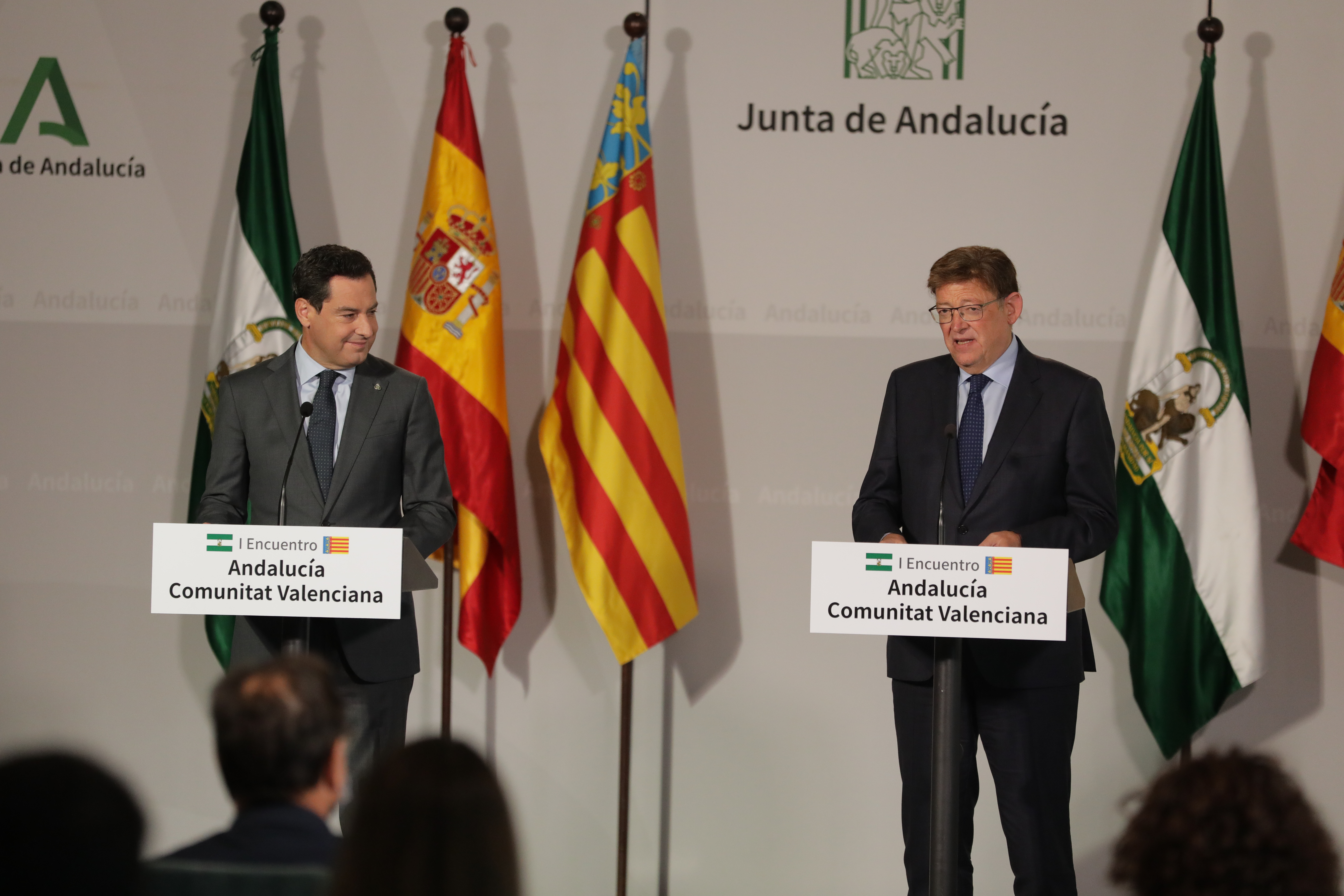 El president de la Generalitat, Ximo Puig y el presidente de la Junta de Andalucía, Juanma Moreno, han firmado una declaración institucional en defensa de un nuevo modelo de financiación autonómica que aporte más recursos a todas las comunidades autónomas y base su reparto siguiendo el criterio de población ajustada.