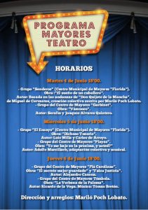 El martes 4 de junio a las 18:00 horas, el Grupo «Senderos», del Centro Municipal de Mayores «Florida», interpretará la obra «El sueño de un caballero», basada en las andanzas de «Don Quijote de la Mancha», de Miguel Cervantes. La obra representada por este Grupo de Mayores está escrita y dirigida por Mariló Poch Lobato. Ese mismo día el Grupo del Centro de Mayores «Garbinet» representará la obra «Vámonos», de los dramaturgos sevillanos, Serafín y Joaquín Álvarez Quintero. El próximo miércoles 5 de junio, el Centro de Mayores «Florida» y su Grupo de teatro «El Ensayo», interpretará la obra «Dichoso Tenorio» de los autores Luis Milla y Carlos de Arroyo. Por su parte, el Grupo del Centro de Mayores «Playas» protagonizarán la obra «Yo me bajo en la próxima, y usted?», una adaptación colectiva y musical del dramaturgo catalán, Adolfo Marsillach.