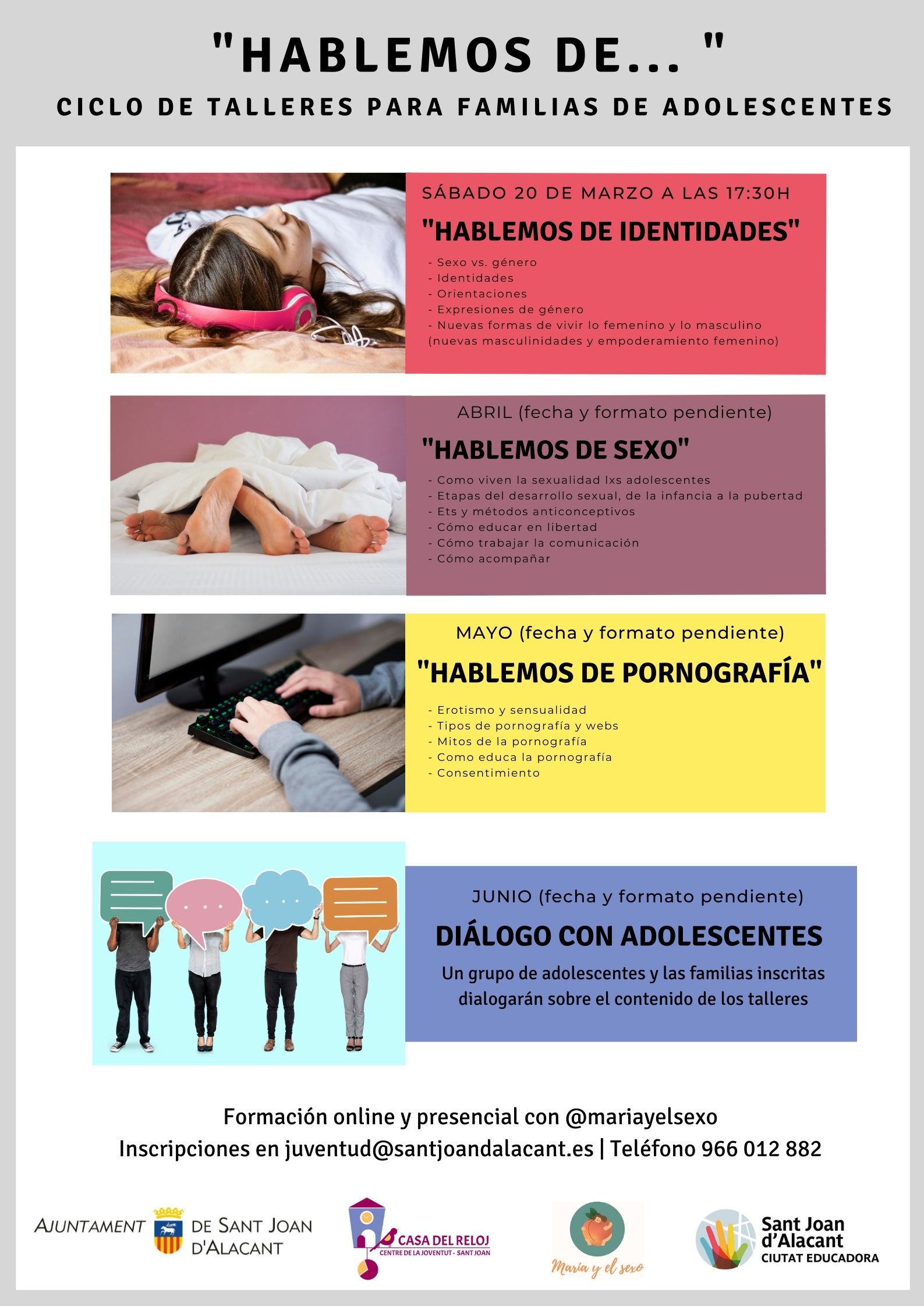 El ciclo de talleres finalizará con un “Diálogo con adolescentes”, que se realizará en el mes de junio, y cuyo objetivo es propiciar un encuentro entre adolescentes y las familias en el que se dialogue de los temas impartidos en los talleres. Las inscripciones se pueden realizar por mail en juventud@santjoandalacant.es o en el teléfono del Centro de la Juventud 966 012 882