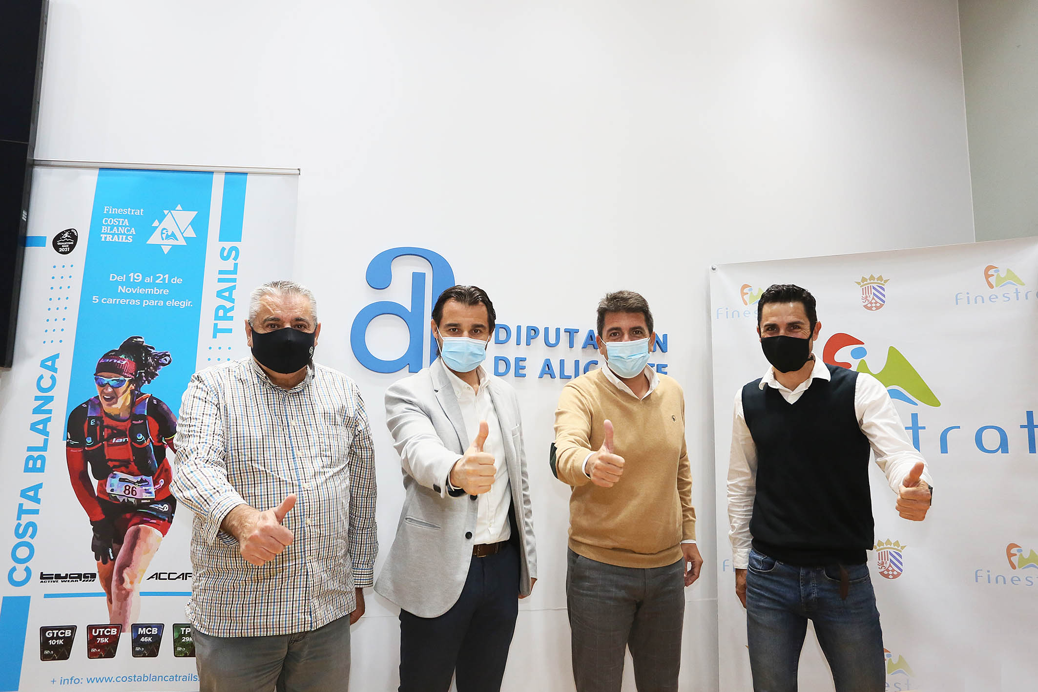 La emblemática prueba de montaña ‘Costa Blanca Trails’ vuelve a batir este año su récord de participación con 1.900 corredores de todo el mundo. La Diputación de Alicante impulsa una nueva edición de este evento deportivo de primer nivel que tendrá lugar este fin de semana en la localidad de Finestrat. El presidente de la institución provincial, Carlos Mazón, ha presentado esta mañana, junto al diputado de Deportes, Eduardo Dolón, el concejal de Deportes del municipio, David Alarcón, y el director técnico del proyecto, Romualdo Doménech, todos los detalles de esta carrera que destaca especialmente por la espectacularidad del entorno natural en el que se desarrolla.