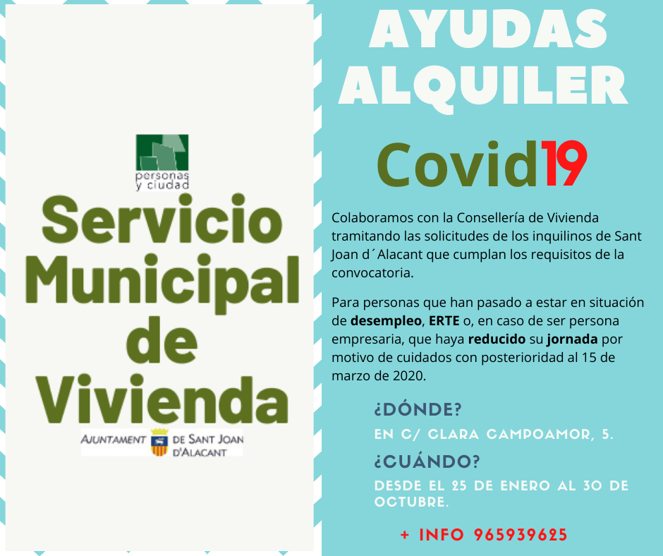 El Servicio Municipal de Vivienda del Ayuntamiento de Sant Joan d´Alacant tramitará estas ayudas en la oficina de la calle Clara Campoamor número 5, a los vecinos que cumplan los requisitos establecidos en el Decreto 204/2020*.. A los interesados se les ofrecerá información de los requisitos, procedimiento y toda la documentación exigida, además de facilitar los formularios necesarios. Tras verificar los requisitos y con toda la documentación recopilada, los solicitantes deberán solicitar cita previa llamando al 965939625 o en vivienda@personasyciudad.es.