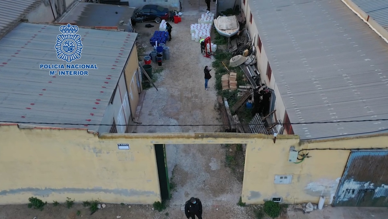 Paralelamente, se pudo comprobar que la organización se estaba abasteciendo de una gran cantidad de productos químicos (precursores), así como de los materiales necesarios para poder establecer el laboratorio clandestino, ubicado en una nave de Almoradí. La envergadura de la nave permitía ubicar diferentes construcciones, todas ellas habilitadas de forma ilegal y dando falsa apariencia de taller mecánico, picadero de caballos y criadero de perros y pájaros. En el centro de la nave apareció construida estratégicamente una vivienda ilegal habilitada como laboratorio clandestino, estando en todo momento custodiada por varias personas de la organización, que realizaban rondas constantes de vigilancia, así como un control de los vehículos y personas que transitaban por las inmediaciones.