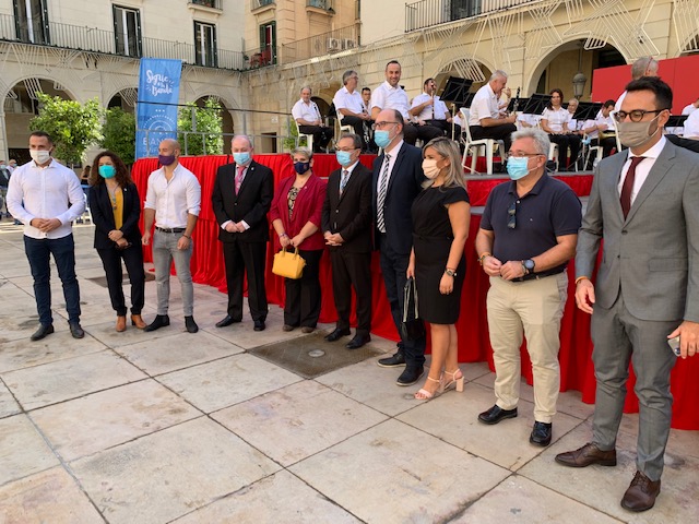 La vicealcaldesa de Alicante, Mª Carmen Sánchez, ha presidido hoy los actos conmemorativos del 9 pd´Octubre que se han desarrollado en la Plaza del Ayuntamiento, con las preceptivas medidas de seguridad derivadas del COVID-19. La edil ha estado acompañado por parte del equipo de gobierno de los concejales Manuel Villar, Antonio Manresa y Adrián Santos, además de otros miembros de la corporación municipal. La Banda Sinfónica Municipal, dirigida por Pedro Lara, ha interpretado piezas del folclore de la Comunidad -«Lo cant del valencià» (Pedro Sosa), «Es chopá… hasta la moma» (Salvador Giner), «La millor terra del món» (Ernesto Rosillo), «Tres dançes valencianes» (Amando Blanquer) y «La Flor del Taronger» (Miguel Asíns). La actuación de la Banda ha finalizado con las interpretaciones de los himnos de Alicante, Comunidad Valenciana y España.