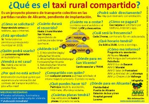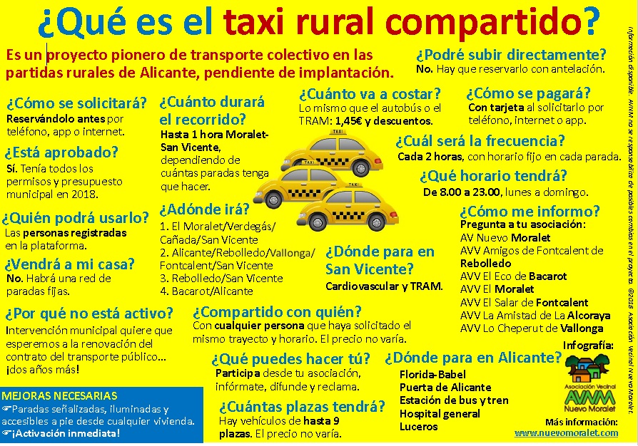 El taxi rural compartido es un proyecto municipal de transporte público en las partidas que consiste en unos trayectos y horarios fijos pero solo funciona cuando se le llama y el billete cuesta lo mismo que el del autobús o tranvía. Después de tres años de trámites, y con presupuesto en 2018, lleva paralizado desde julio de ese año por los reparos del interventor, que considera necesario esperar al nuevo proyecto de servicio público en redacción, para el que se acaba de aprobar una extensión de dos años. La implantación del transporte público en las partidas es “irregular y deficiente”, con algunas pedanías sin transporte, como El Moralet, y otras con un servicio de autobús a la ciudad con tres cuatro viajes al día. Los colectivos vecinales esperan que “se desbloquee este expediente, que viene a cubrir una necesidad básica prioritaria común para los habitantes de las partidas”. Por su parte, como muestra de apoyo, desde Radio Tele Taxi contemplan lucir en sus vehículos la infografía elaborada por Nuevo Moralet para suplir el desconocimiento de este servicio por parte de la ciudadanía con una serie de preguntas y respuestas sencillas. Tanto los colectivos vecinales como la asociación de taxis esperan que se pueda implantar a la mayor brevedad este servicio pionero contra la despoblación de las zonas rurales de Alicante.