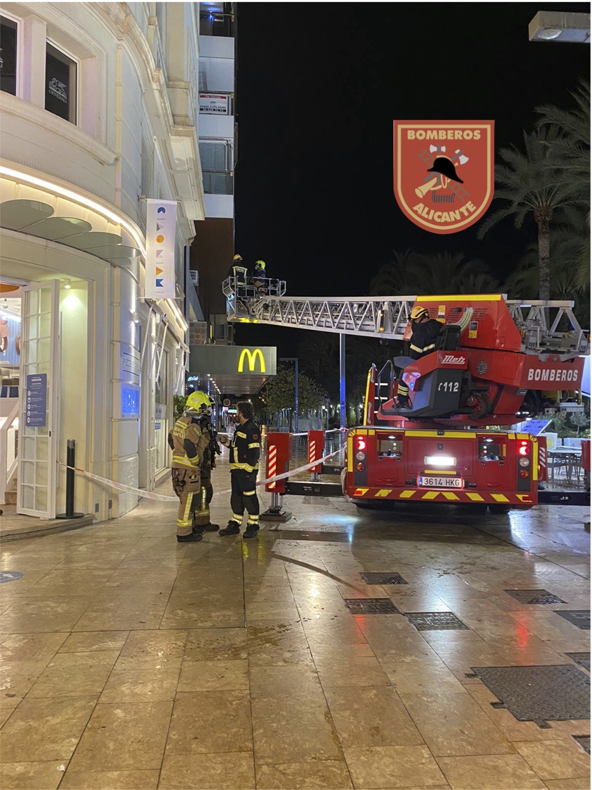 Los bomberos tienen que acudir a sanear una cornisa en la Explana de España con el vehículo escalera, tras el desprendimiento de parte de la fachada