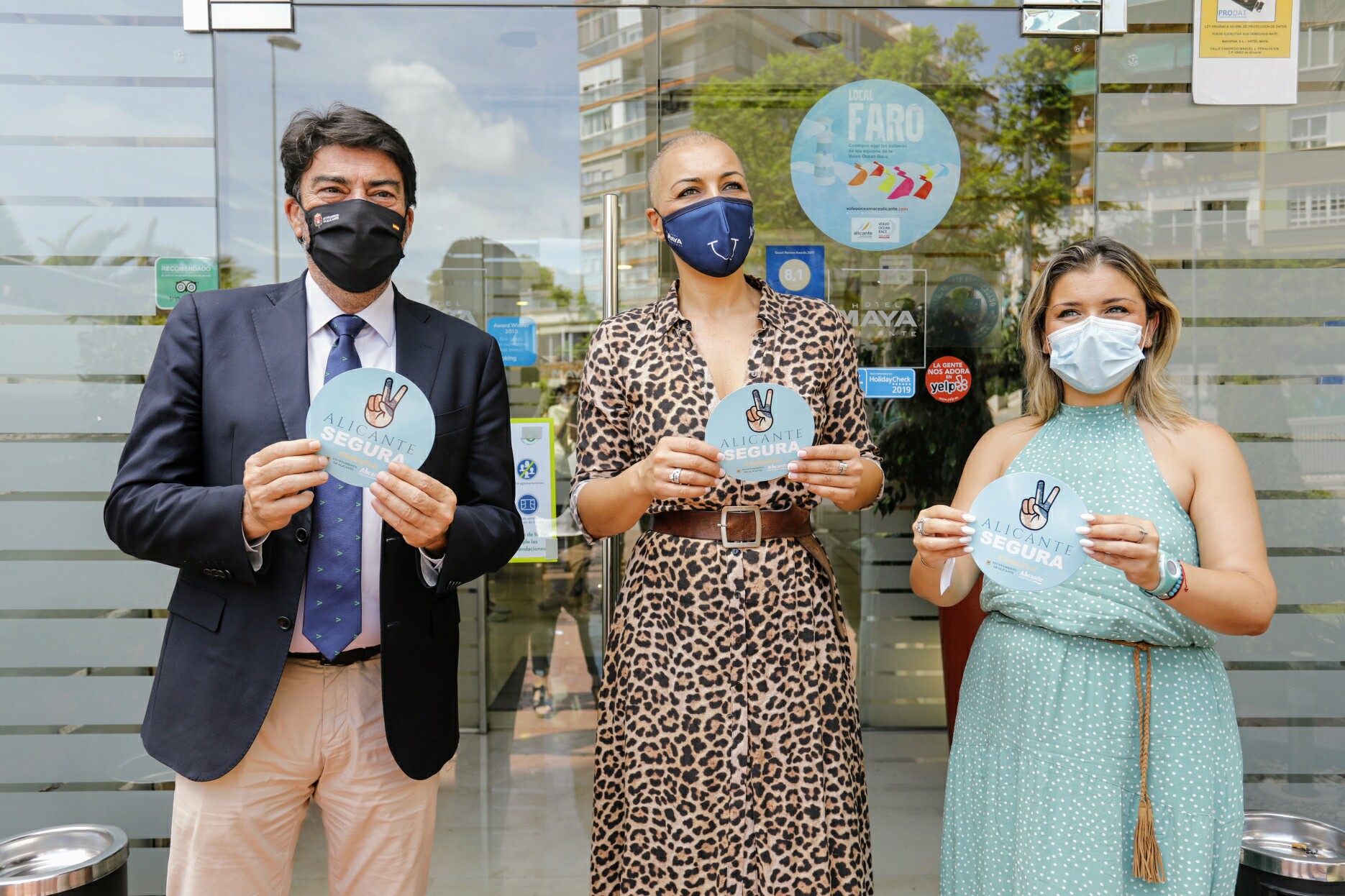 El alcalde de Alicante, Luis Barcala, y la concejal responsable de Turismo, Mari Carmen Sánchez, han acudido hoy al hotel Maya para imponerle el distintivo Alicante Segura en presencia de su directora y máxima responsable de APHA, Victoria Puche. El acto ha tenido un significado especial al sobrepasarse en la primera semana de promoción de esta acción para garantizar la seguridad de clientes y trabajadores de los establecimiento el centenar de peticiones para acogerse al distintivo Alicante Segura.