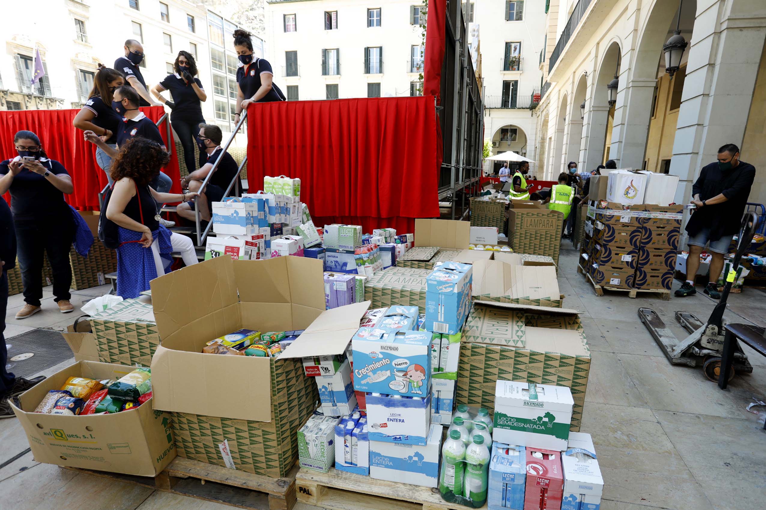Miles de festeros y alicantinos anónimos, estos últimos han superado los 500, han participado durante todo el día de hoy en la Ofrenda Solidaria que se ha desarrollado en la Plaza del Ayuntamiento. Durante todo el día, como ha explicado el concejal de Fiestas, Manuel Jiménez, se han recogido más de 26 toneladas de productos de primera necesidad para entregar a los afectados por las consecuencias del COVID-19.