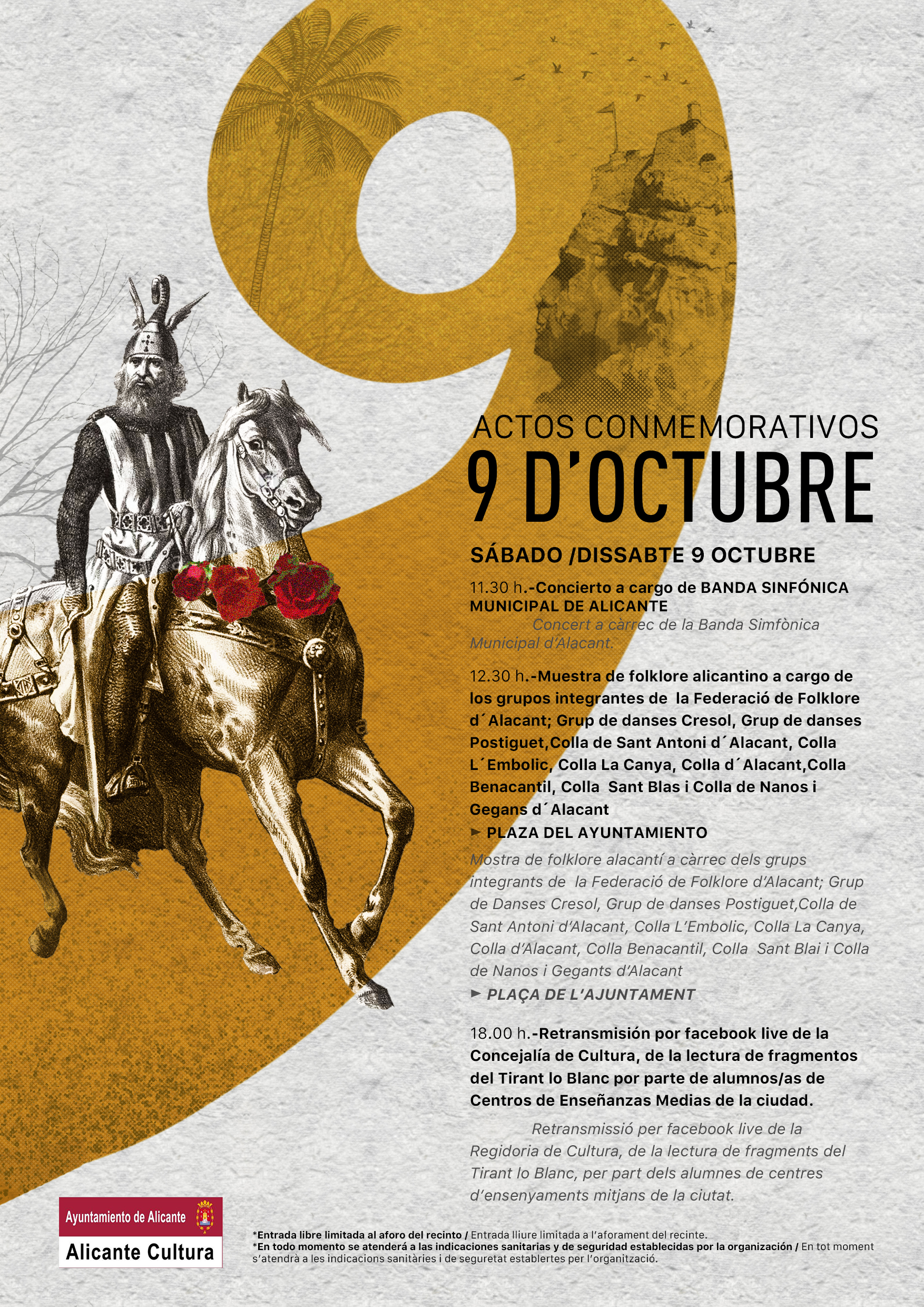 El Ayuntamiento de Alicante, a través de la concejalía de Cultura, ha programado un concierto de la Banda Sinfónica Municipal , y una exhibición de folclore alicantino como centro de sus actividades del 9 d’Octubre. El recital se celebrará a las 11.30 horas en la Plaza del Ayuntamiento y, a continuación, actuarán los grupos de danzas populares y collas.