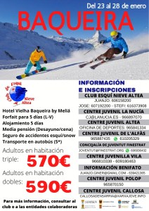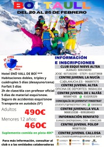 La concejalía de Juventud del Ayuntamiento de Finestrat presenta las nuevas escapadas a la nieve para este curso. Las excursiones, organizadas por el Club de Esquí de Altea, se ofertan junto a los Ayuntamientos de Finestrat, Altea, La Nucia, L’Alfàs del Pi, Polop, La Vila Joiosa, Callosa d’en Sarrià y Benifato.